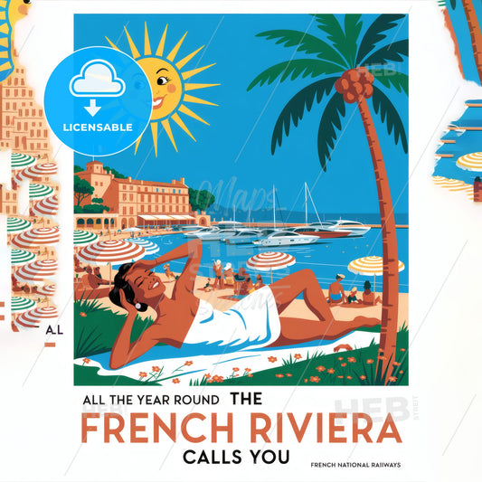 Vintage Riviera Bliss: Art Deco Mediterranean Beach Escape Poster