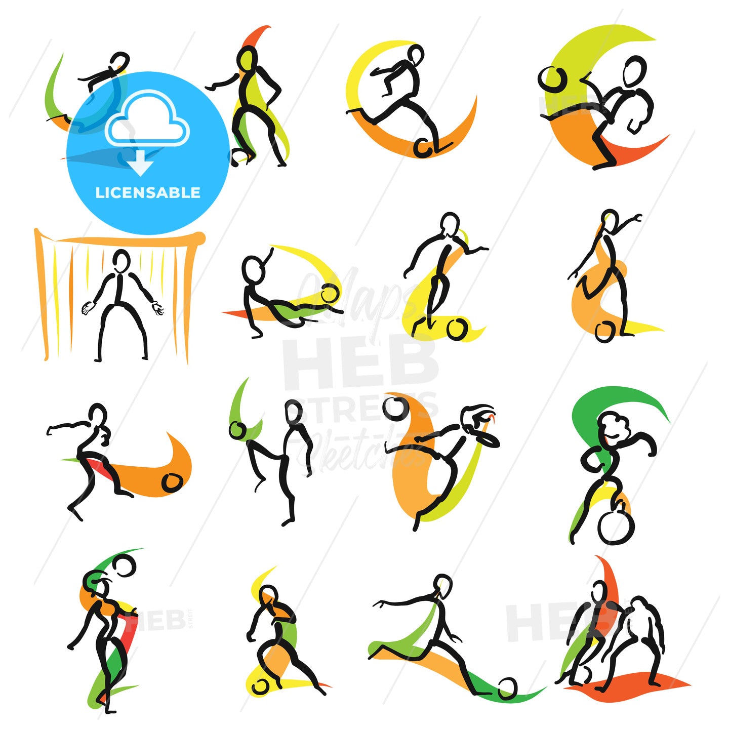 16 Soccer Doodle Icons Set, hand drawn sketches with colored swipe on white backgound. Vector art.
