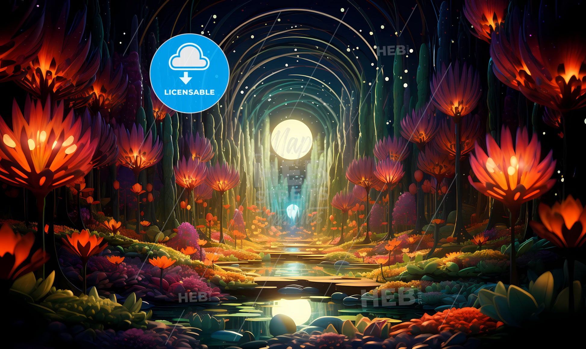 A Stream With Trees And Flowers, Abstract sun and forest landscape pattern.