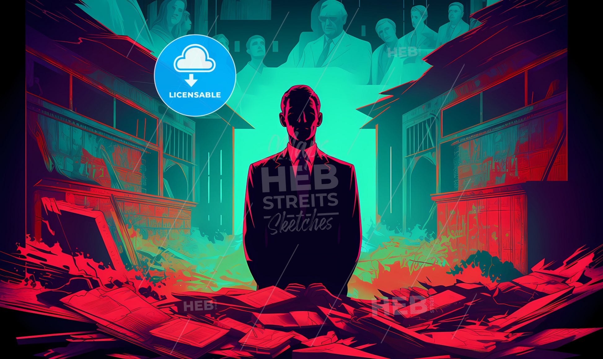 A Man Standing In Front Of A Pile Of Books, neo-pop iconography anaglyph effect.