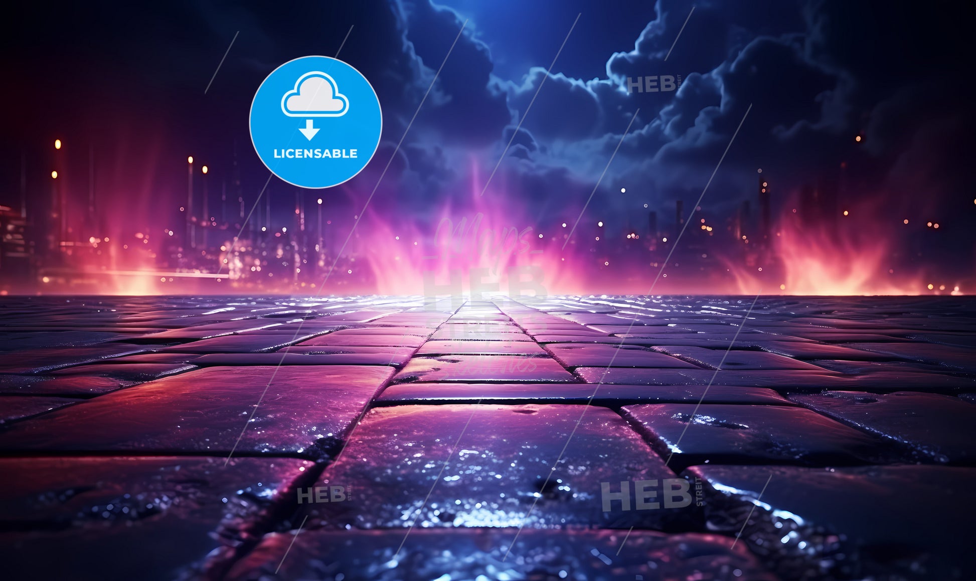 A Stone Road With A City In The Background, Wet asphalt reflection of neon lights.