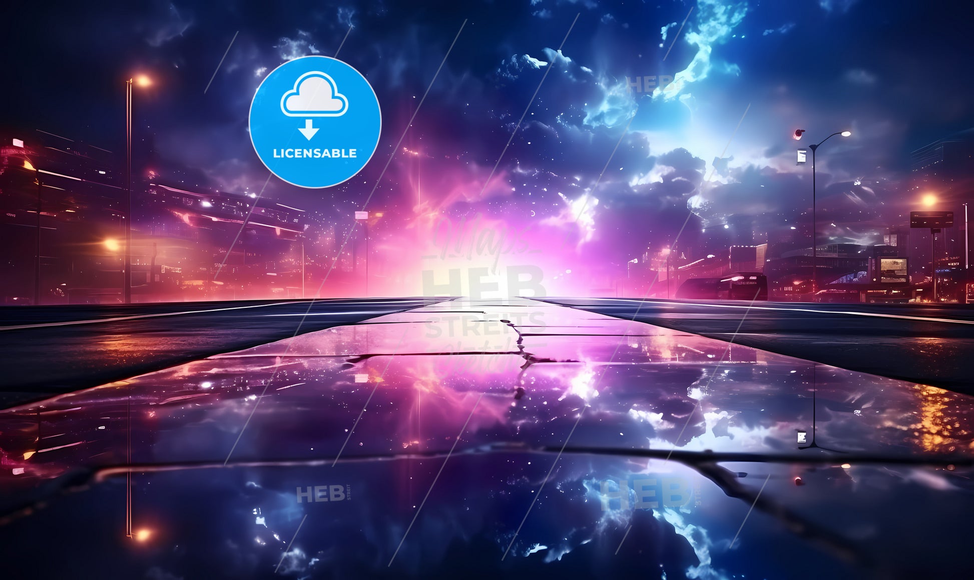 A Road With A Bright Light In The Background, Wet asphalt reflection of neon lights.