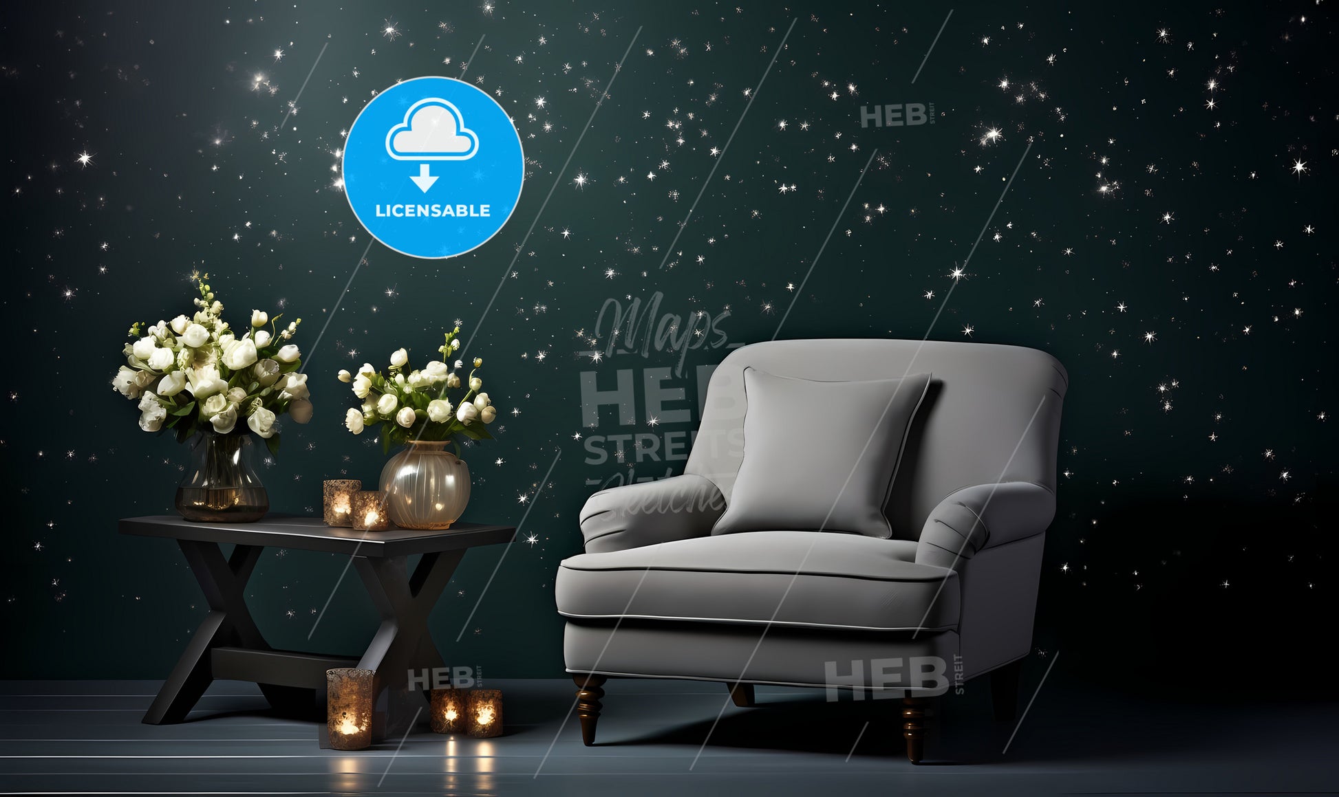 A Chair And Flowers In A Room, Living room with gray armchair.
