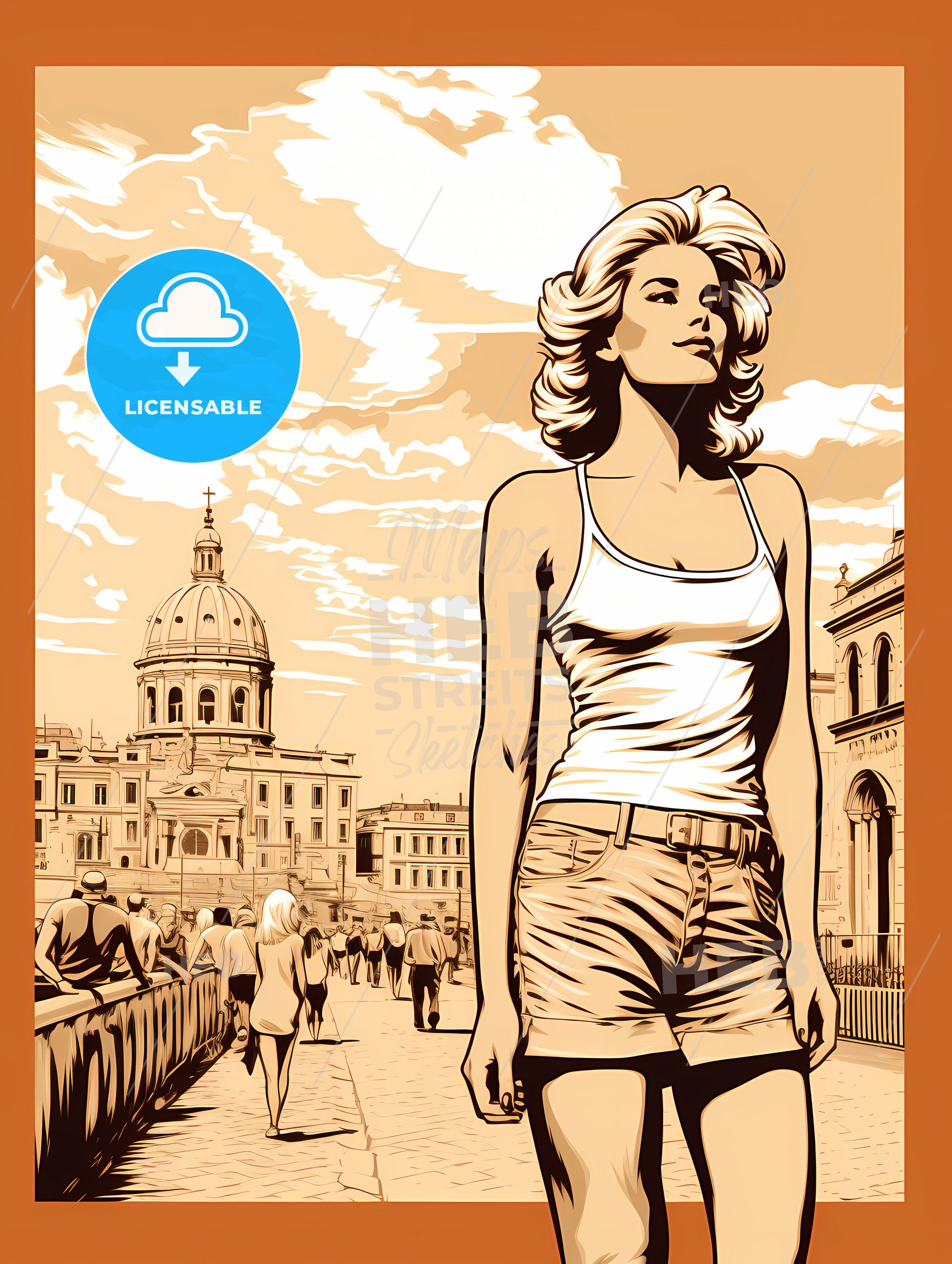 A Woman Walking Down A Street, young adult woman in a city on vacation.
