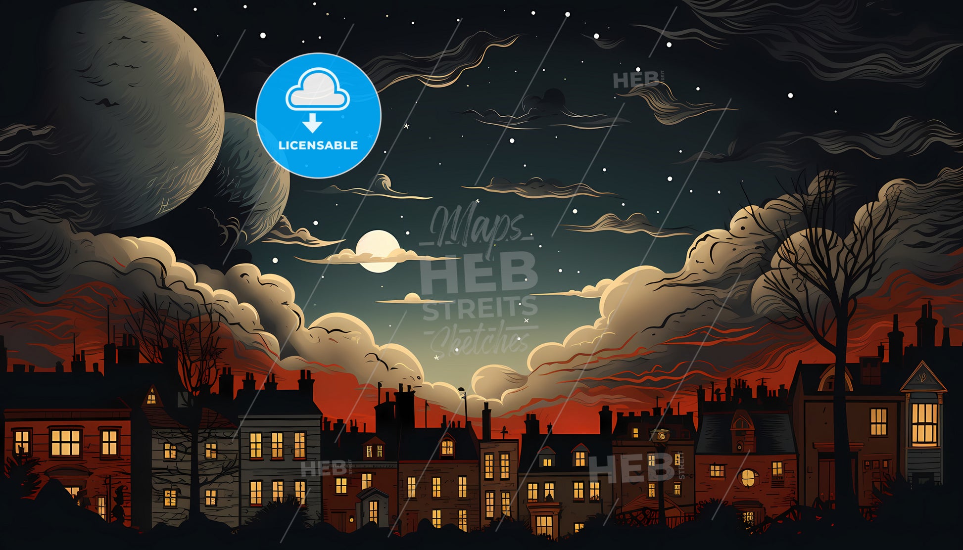A Cityscape At Night With Clouds And Moon, Christmas night in the city.