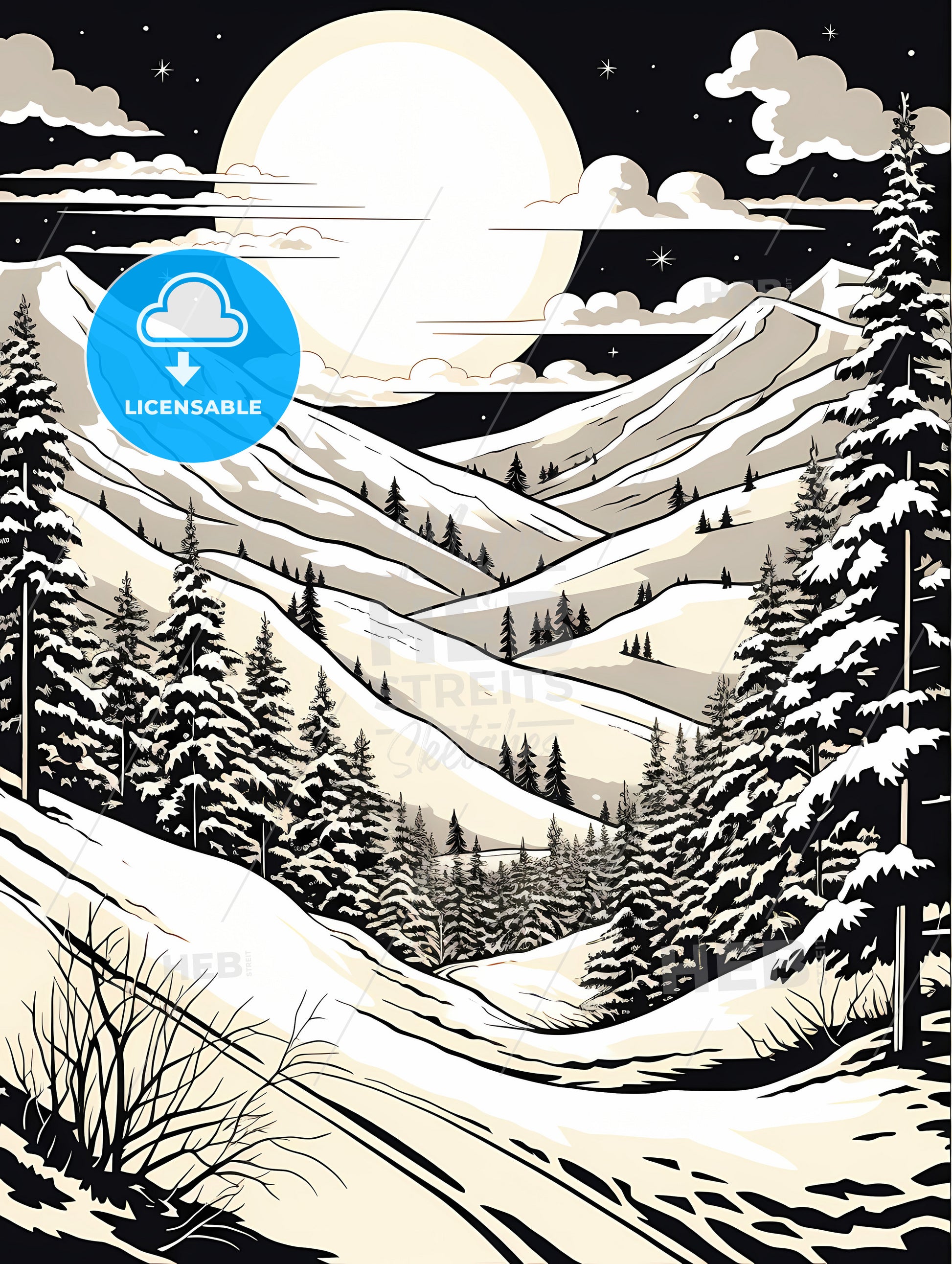 A Black And White Illustration Of A Snowy Mountain Range, Aspen Snowmass Colorado.