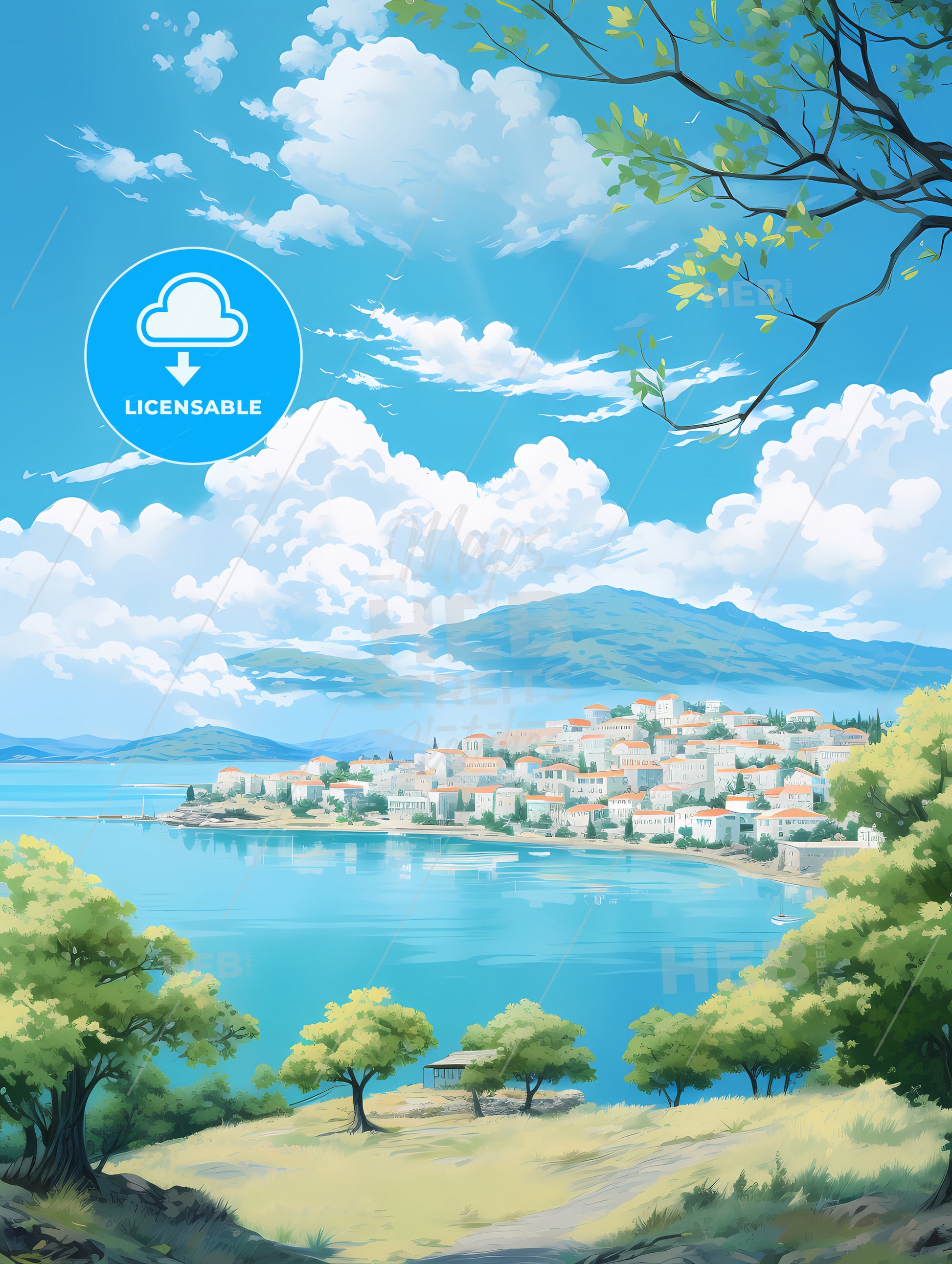 Larissa Greece Skyline, a landscape of a town by a body of water.