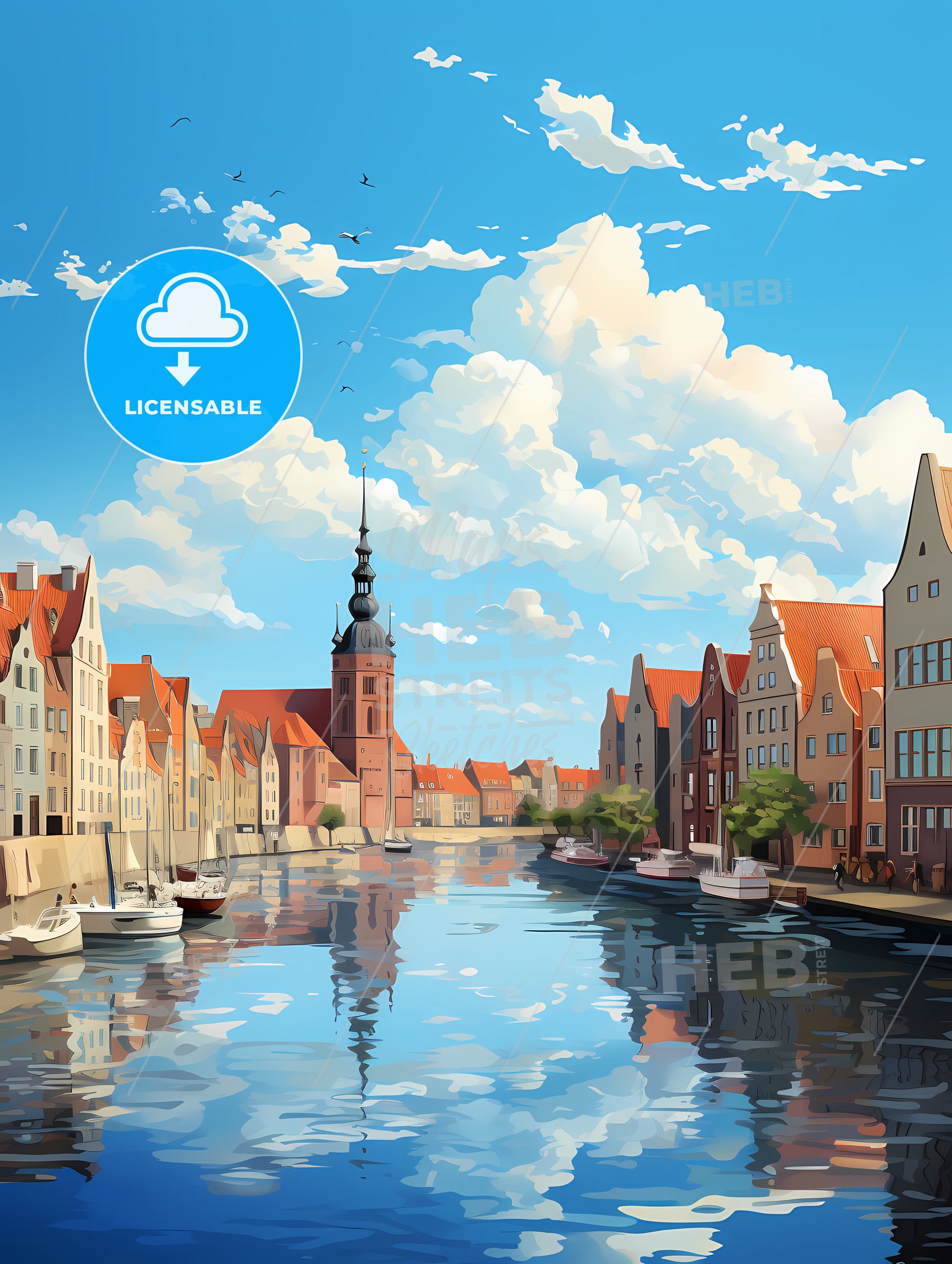 Gdask Polska Skyline, a river with boats and buildings in the background.