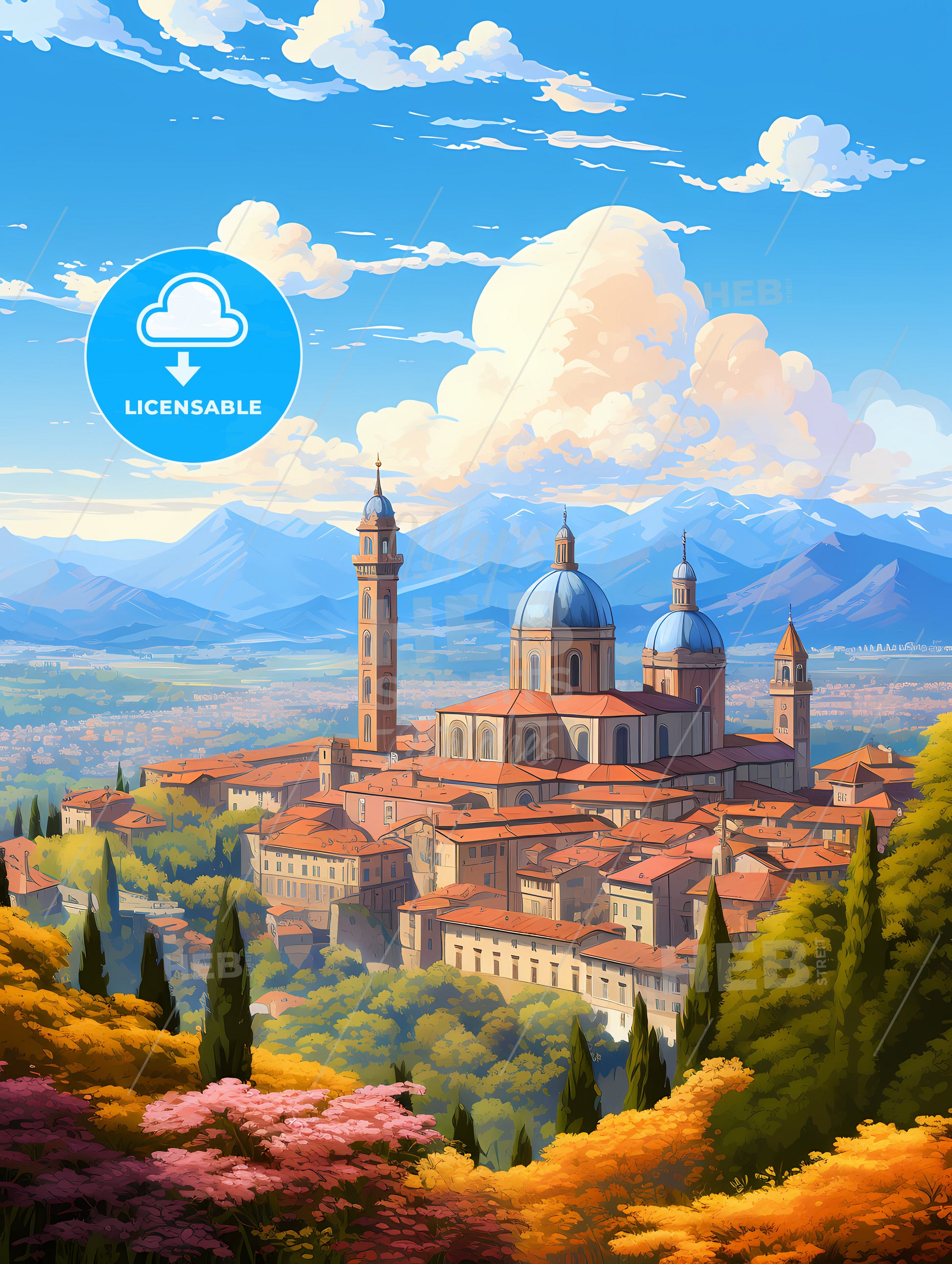 Bergamo Italy Skyline, a building with towers and trees in front of mountains.