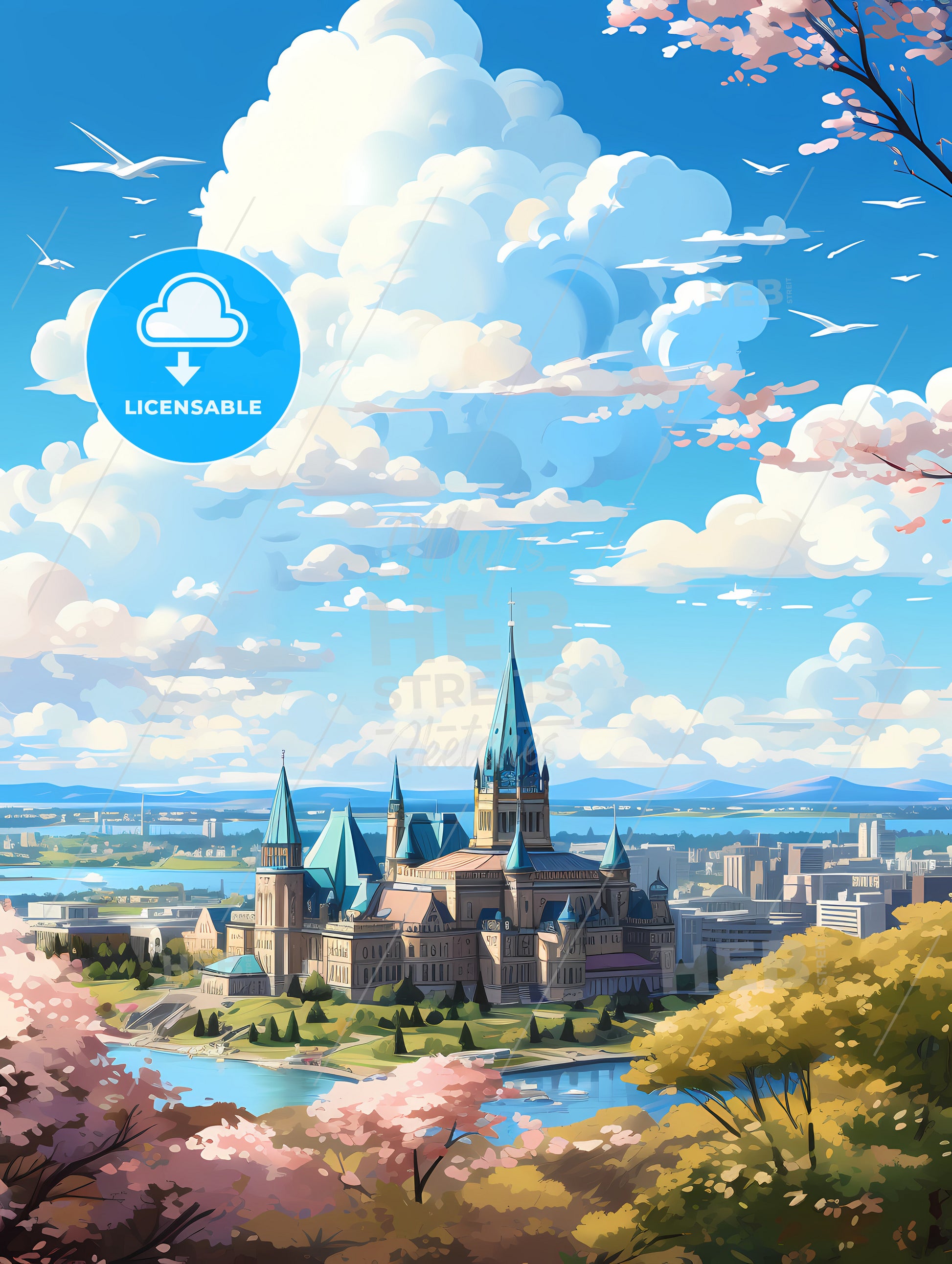 Ottawa Canada Skyline, a castle with a river and trees in the background.