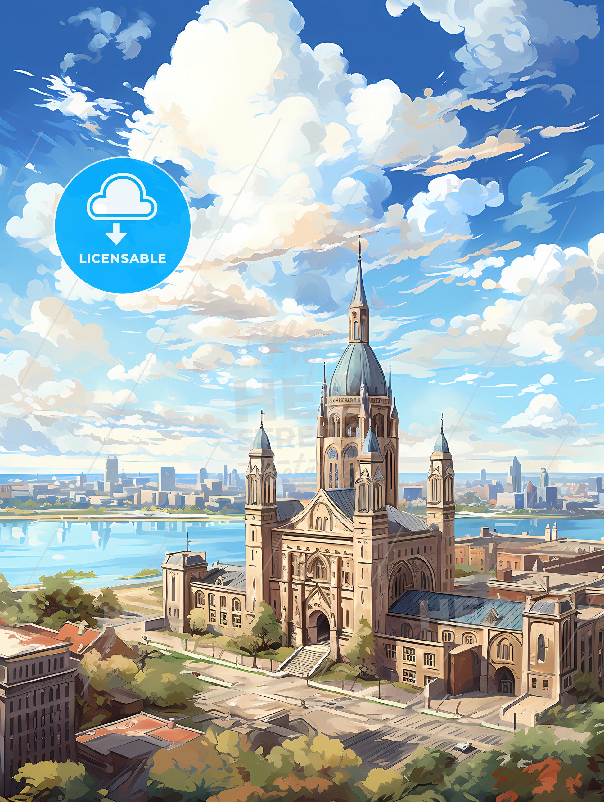 Detroit Michigan Skyline, a large building with a tower and a body of water.
