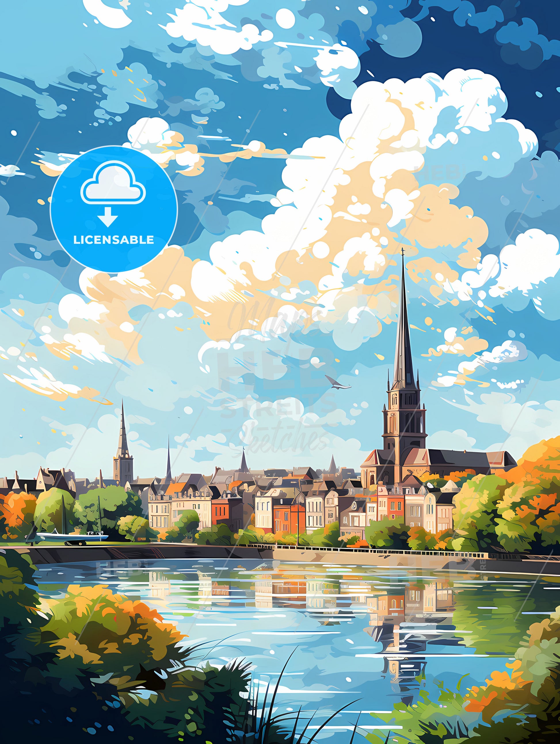 Arnhem Netherlands Skyline, a water body with a church and trees in the background.