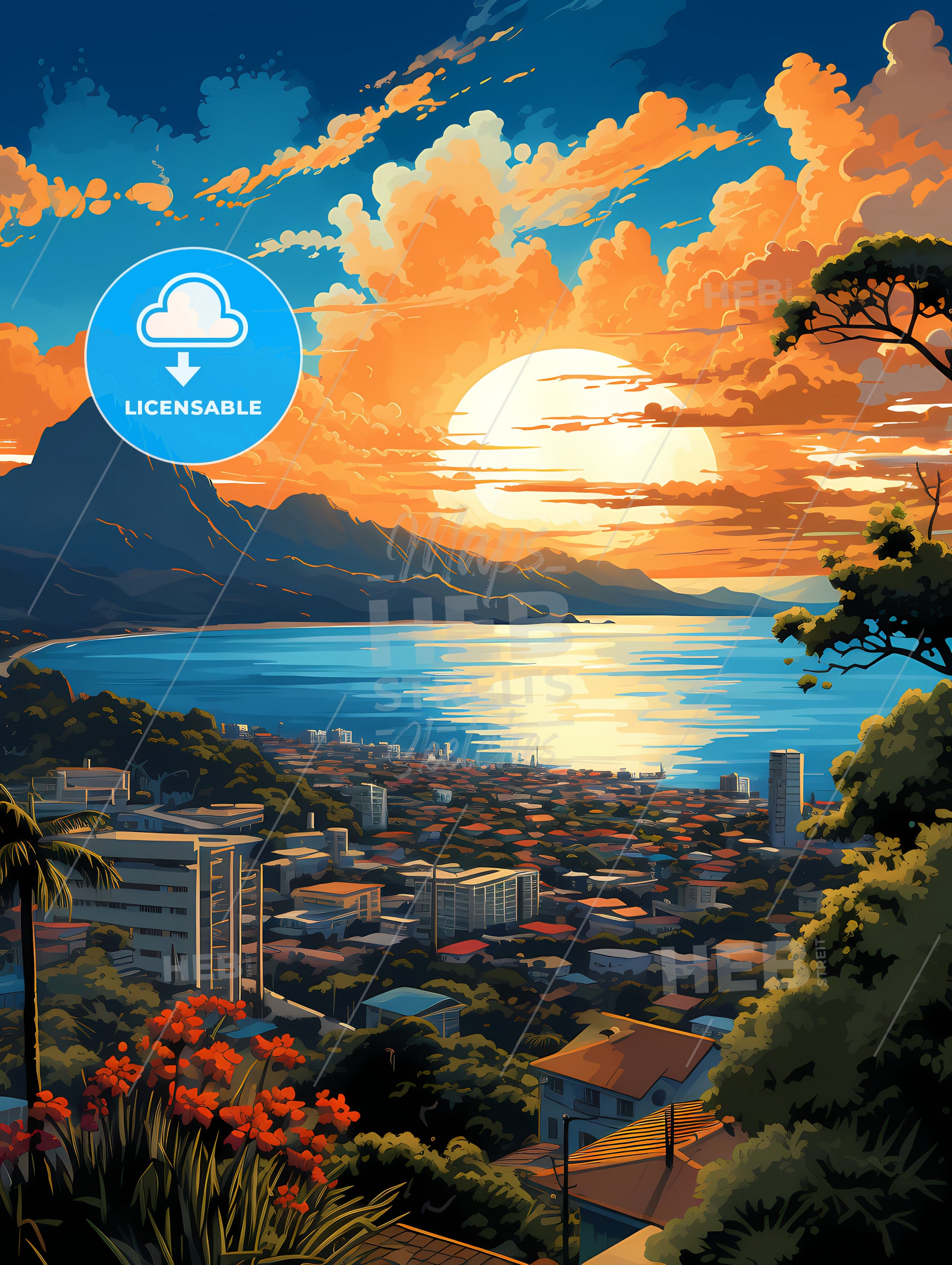 Port Moresby Papua New Guinea Skyline, a sunset over a city.