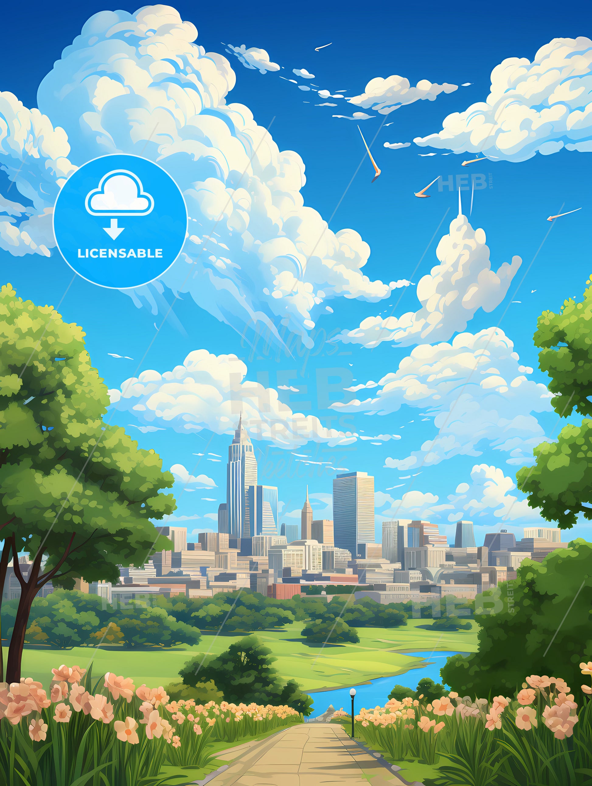 Omaha Nebraska Skyline, a landscape of a city with trees and a river.