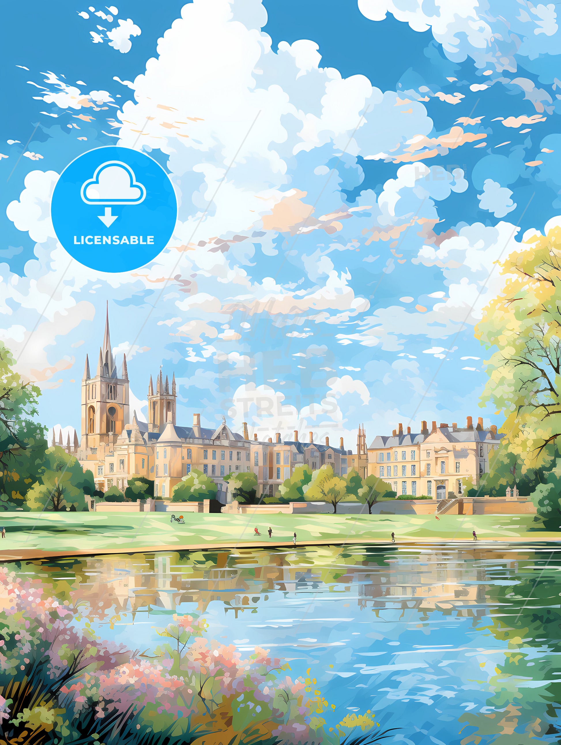 Cambridge England Skyline, a water body with trees and buildings in the background.