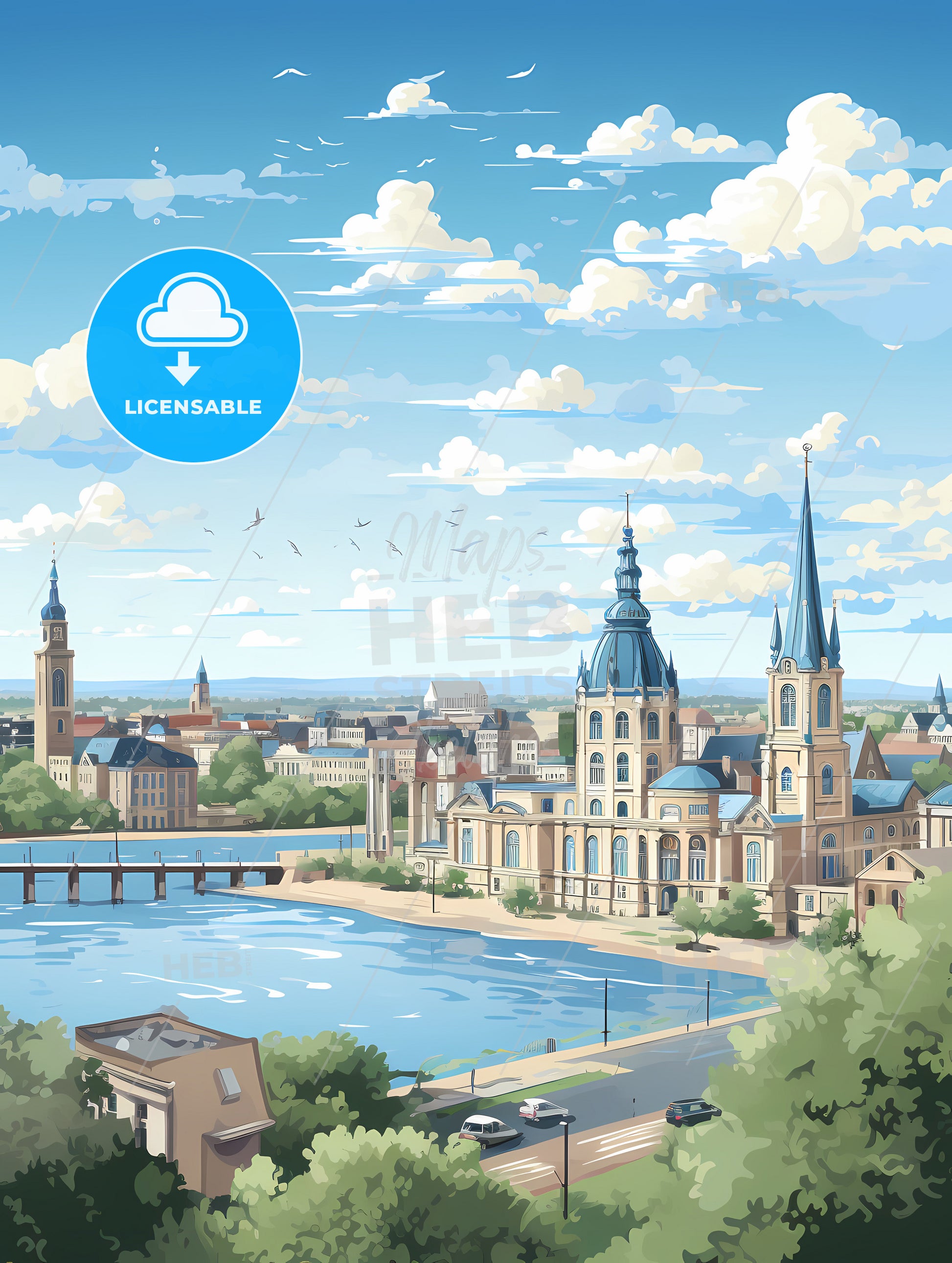 Magdeburg Germany Skyline, a city with a bridge and trees.