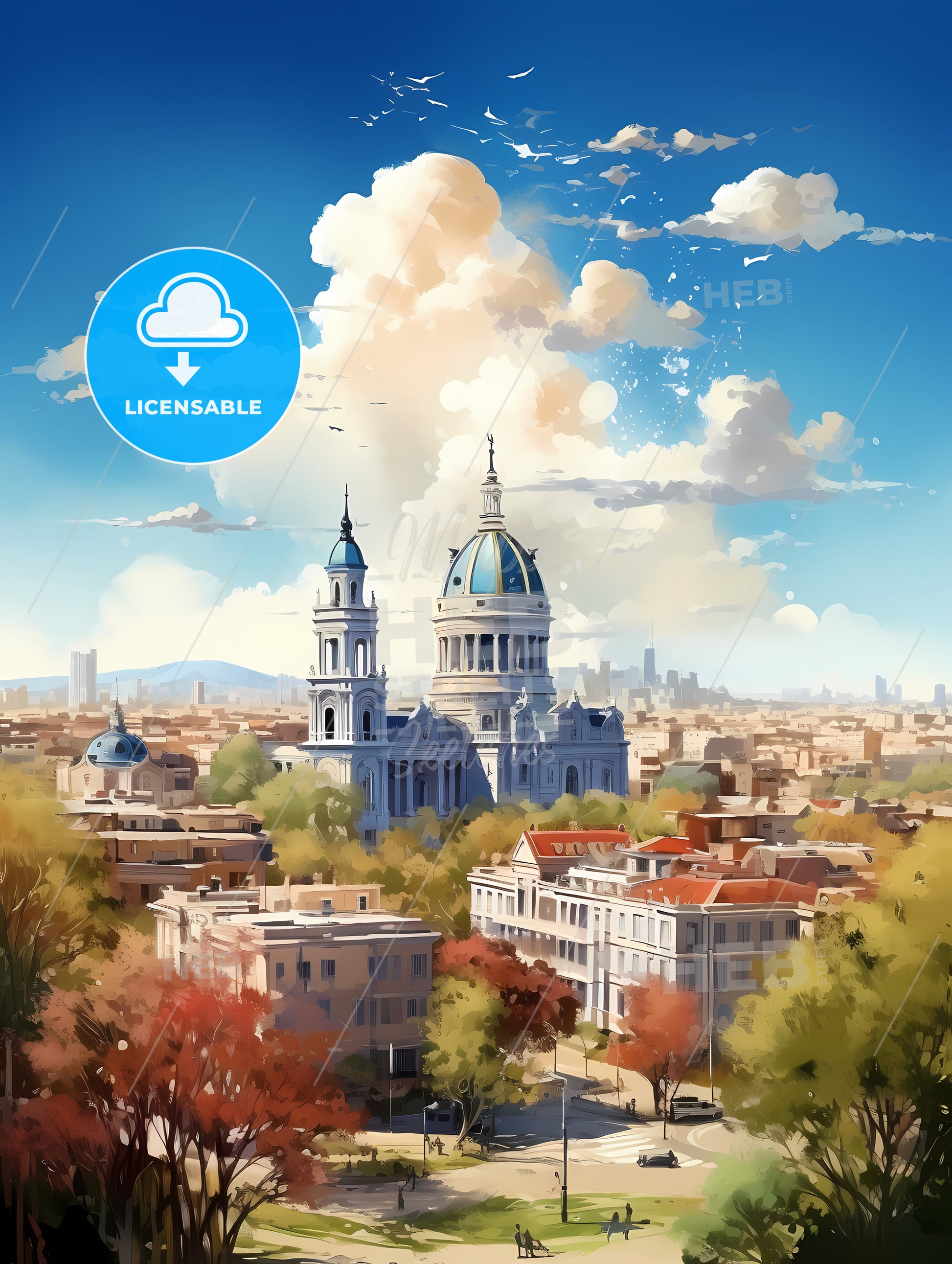 Madrid Spain Skyline, a large building with a dome roof and a blue sky with clouds.