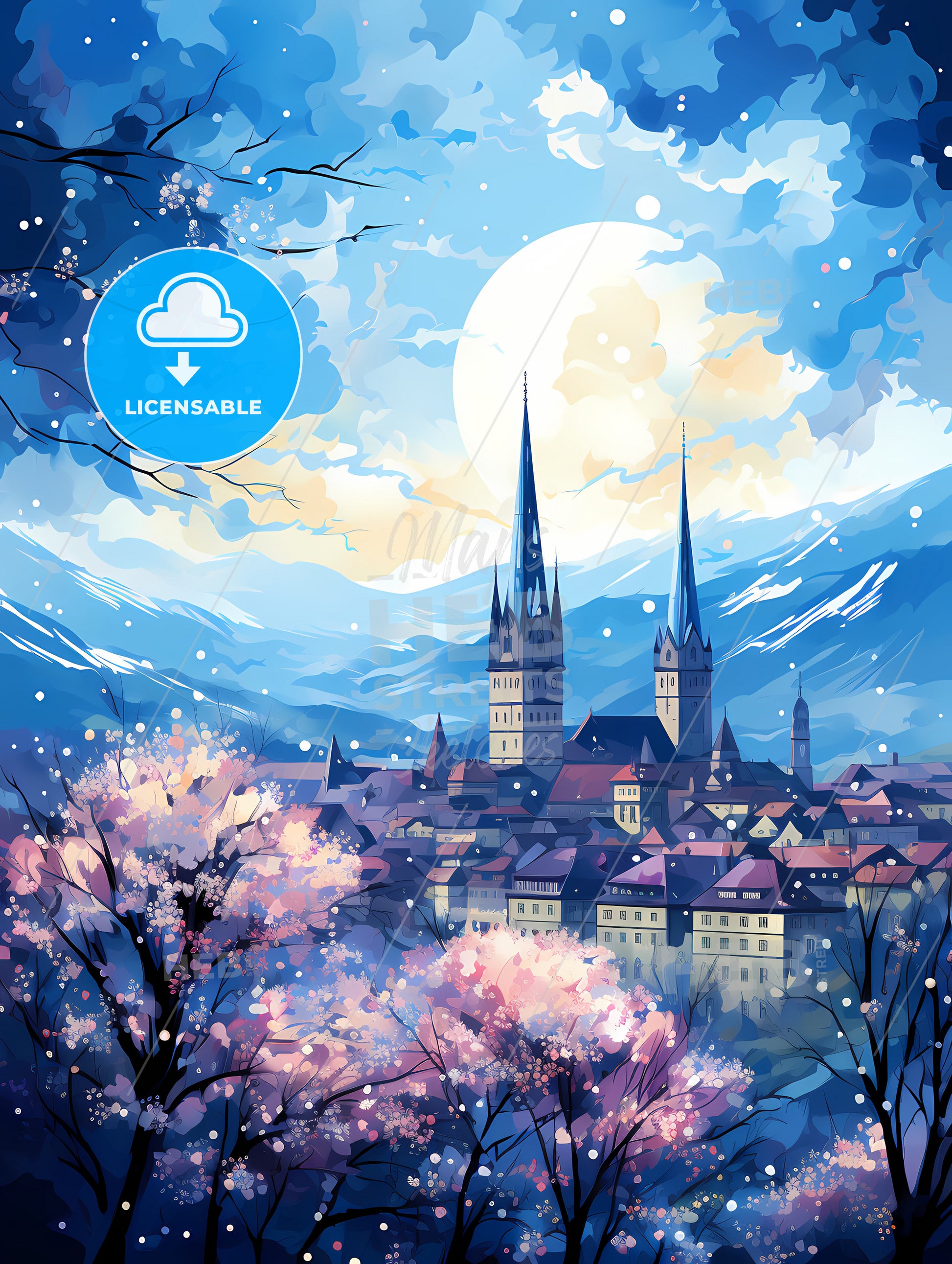 Winterthur Switzerland Skyline, a city with a castle and mountains in the background.