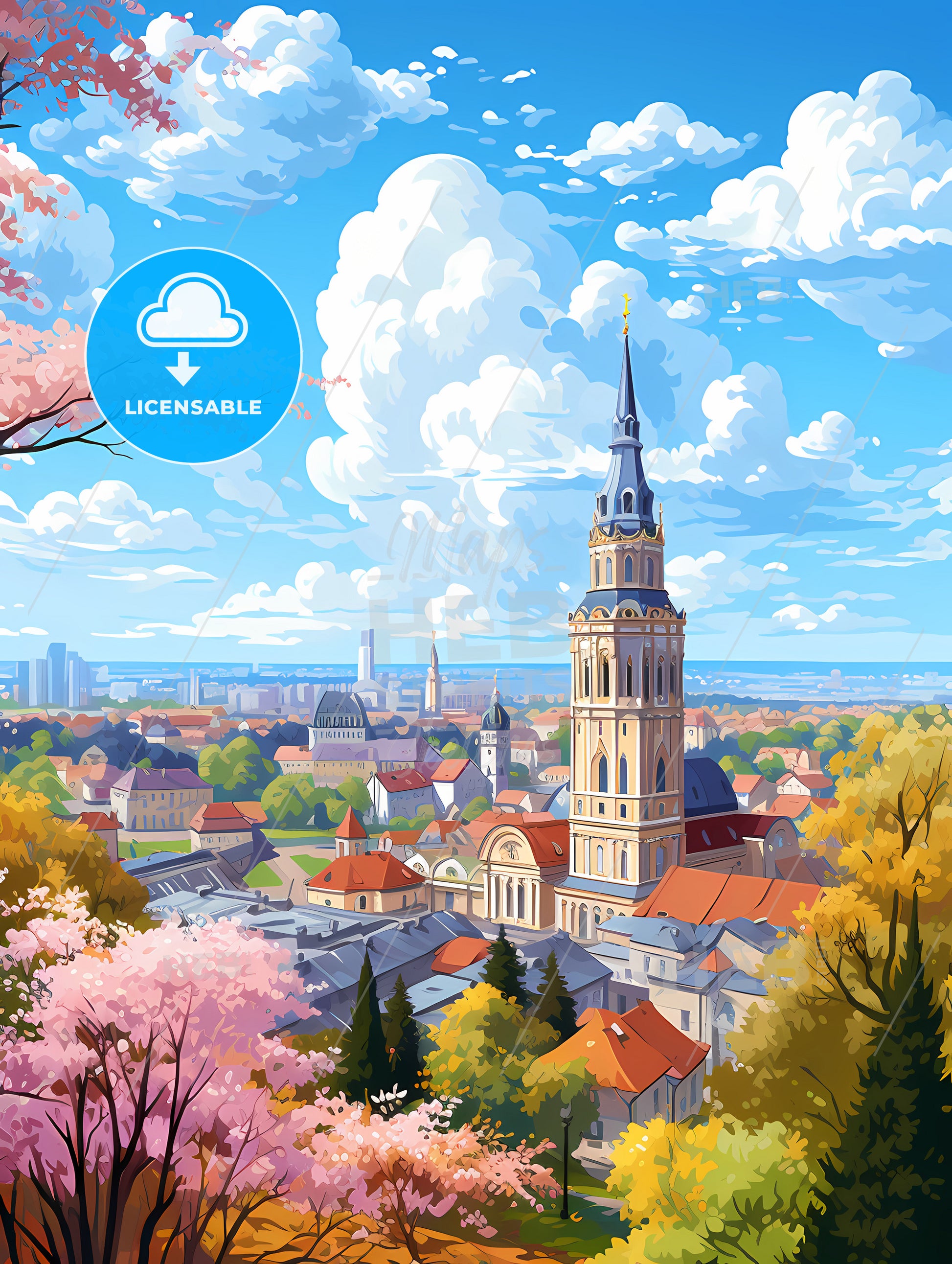 Vilnius Lithuania Skyline, a city with a tower and trees.