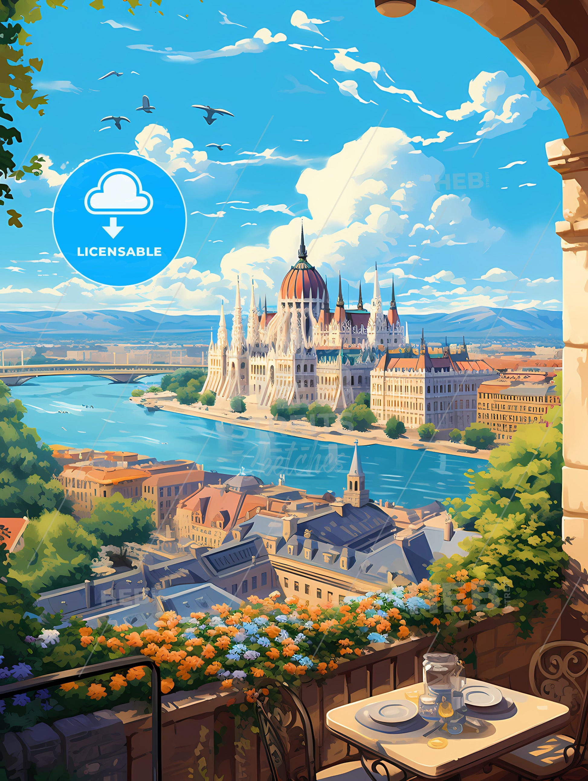Budapest Hungary Skyline, a castle with a river and birds in the sky.