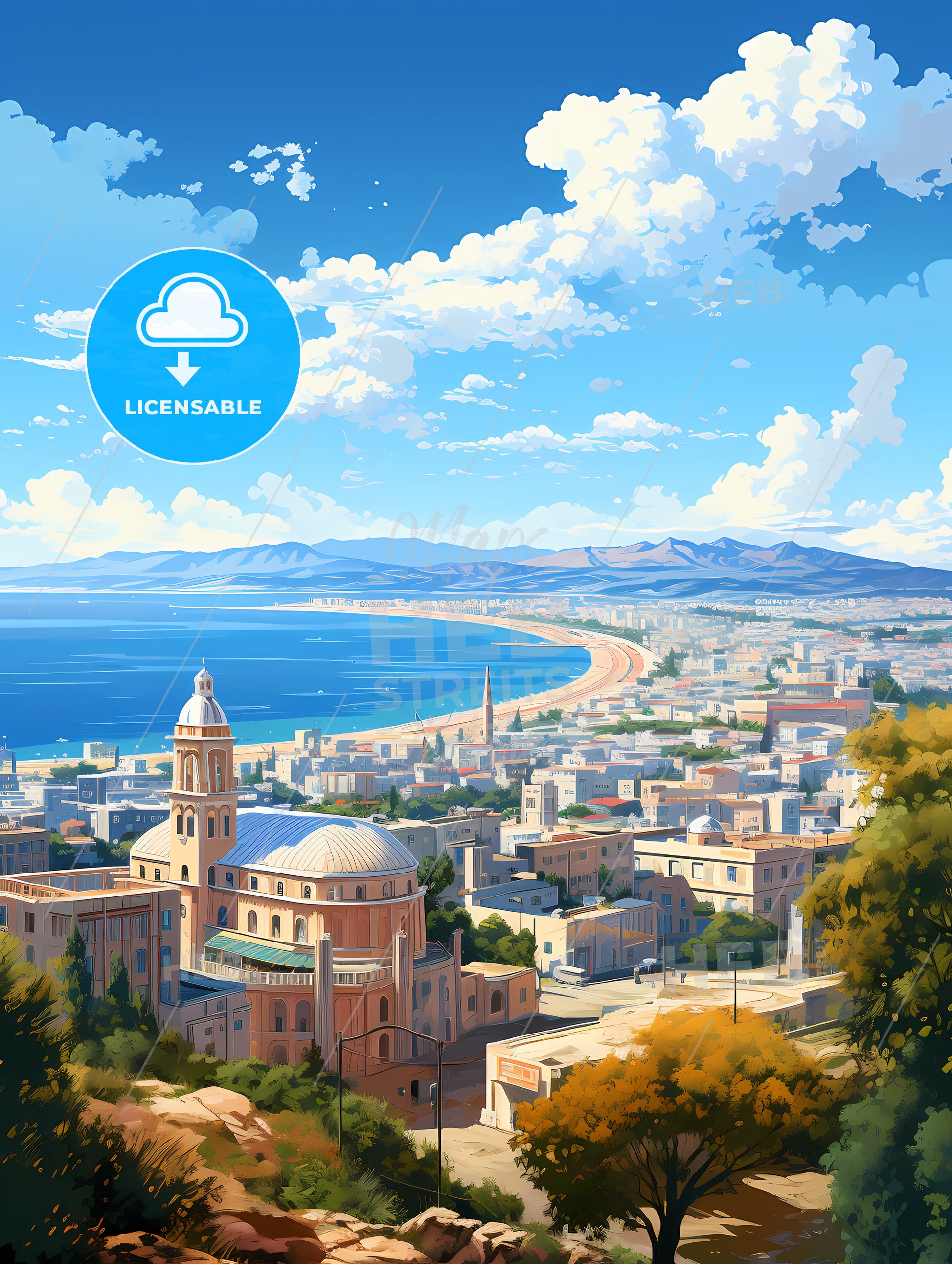 Algiers Algeria Skyline, a city with a large building and a body of water.