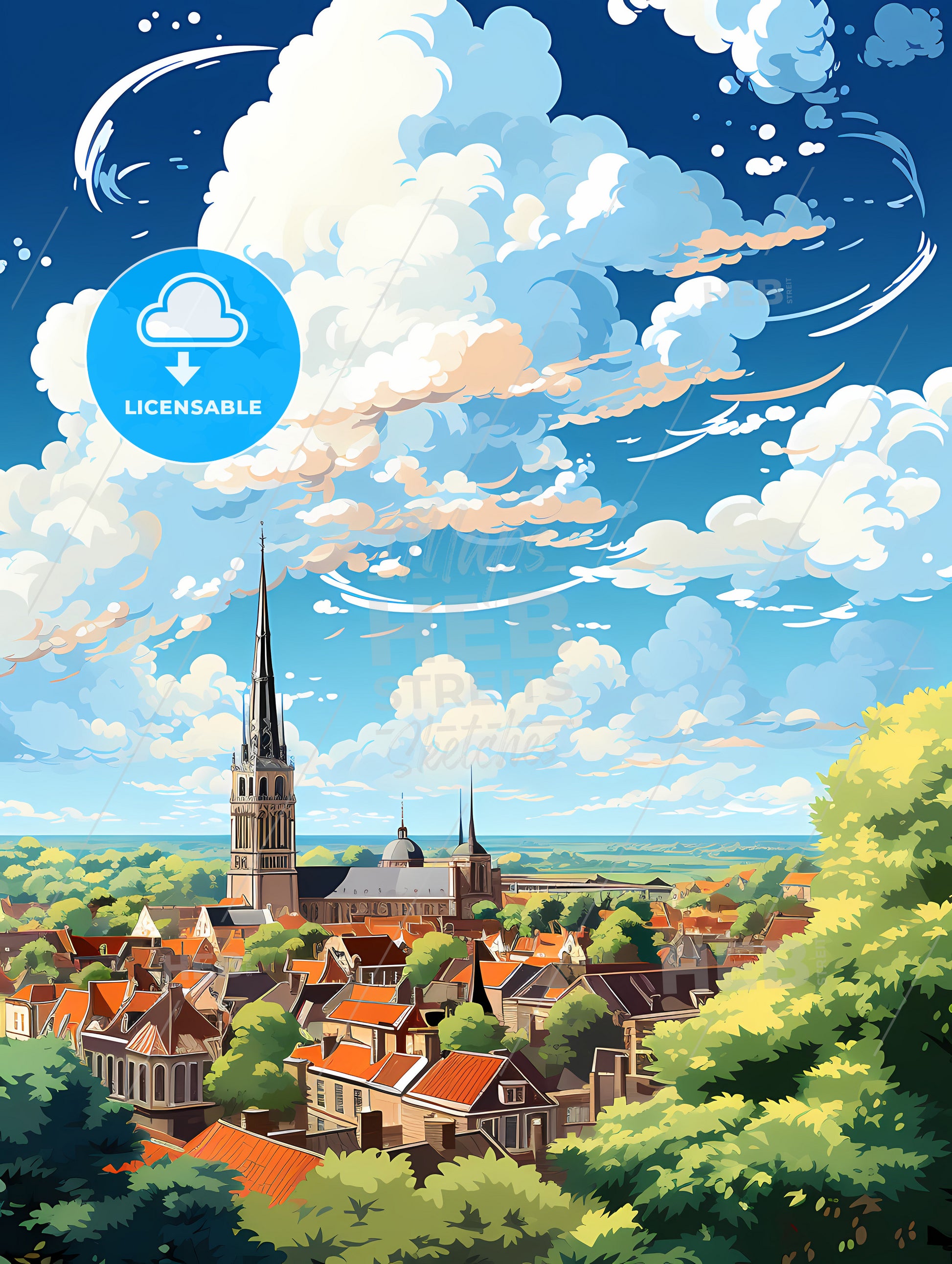 Enschede Netherlands Skyline, a city with a tower and trees.
