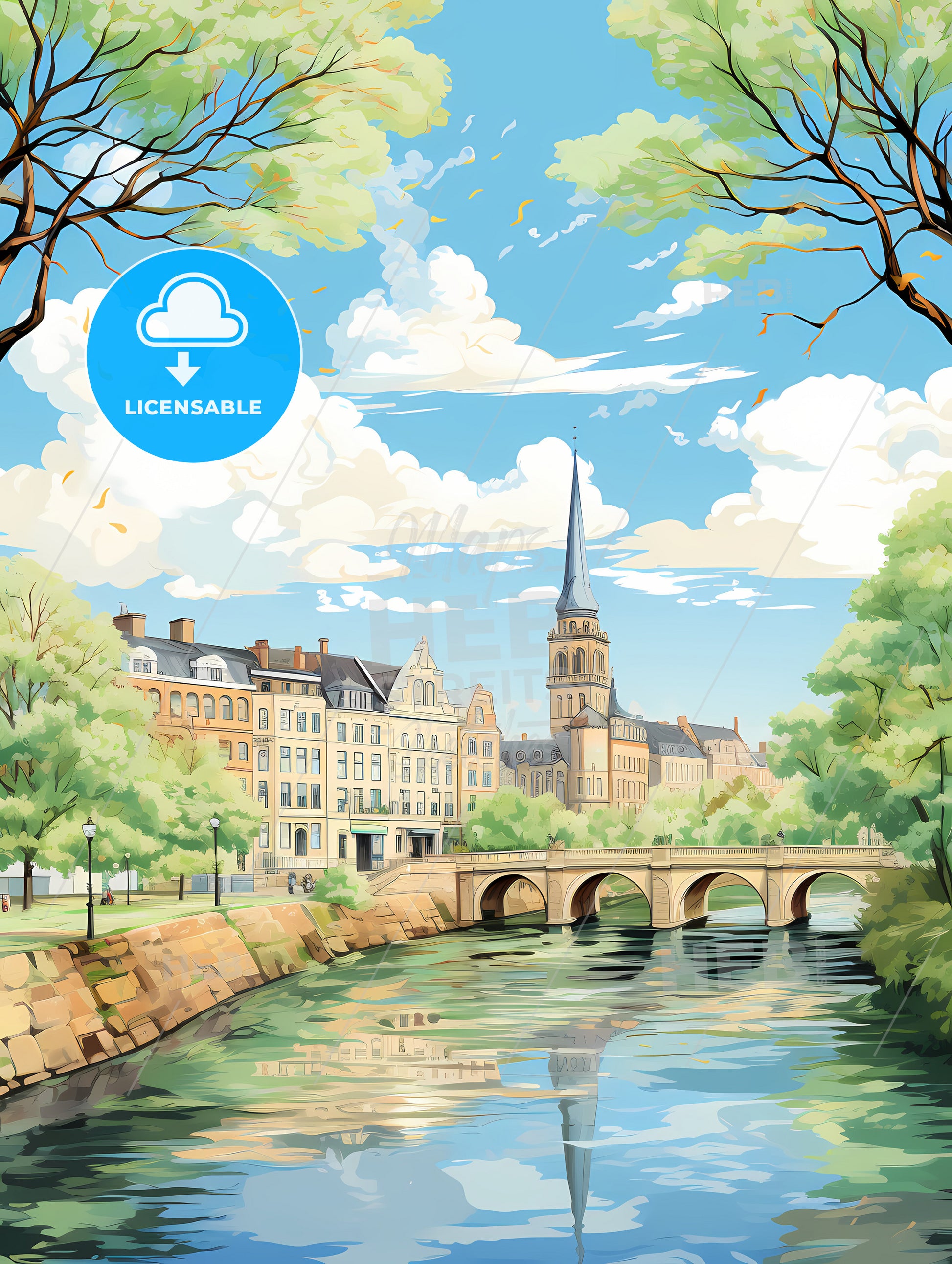 Breda Netherlands Skyline, a bridge over a river with trees and buildings.