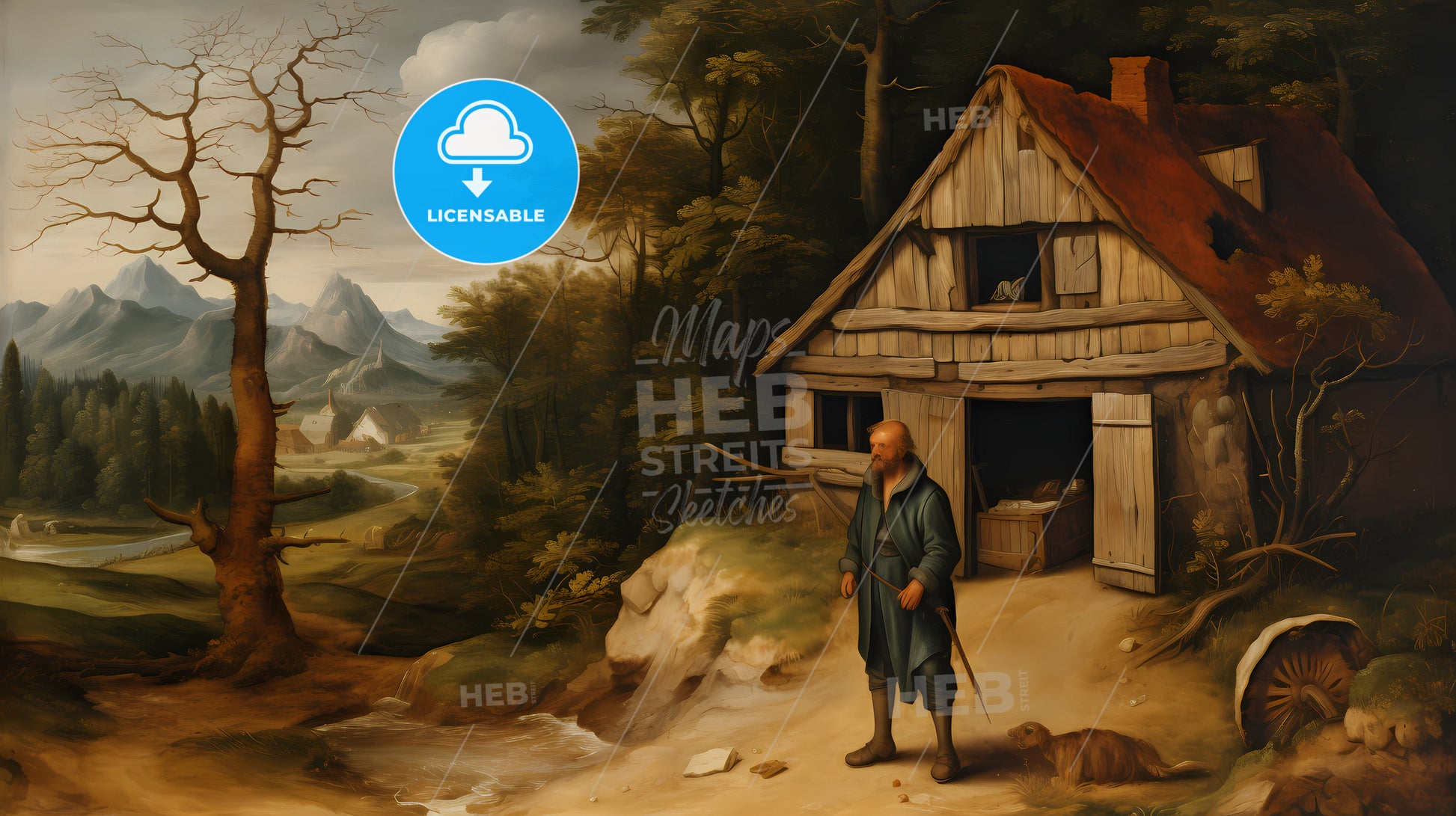 1500S Painting Of Disheveled Man, a painting of a man standing in front of a house.