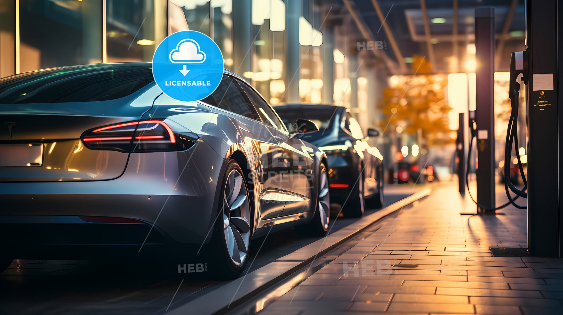 Charging Car At Modern Fast Electric Vehicle, a group of cars parked on a sidewalk.