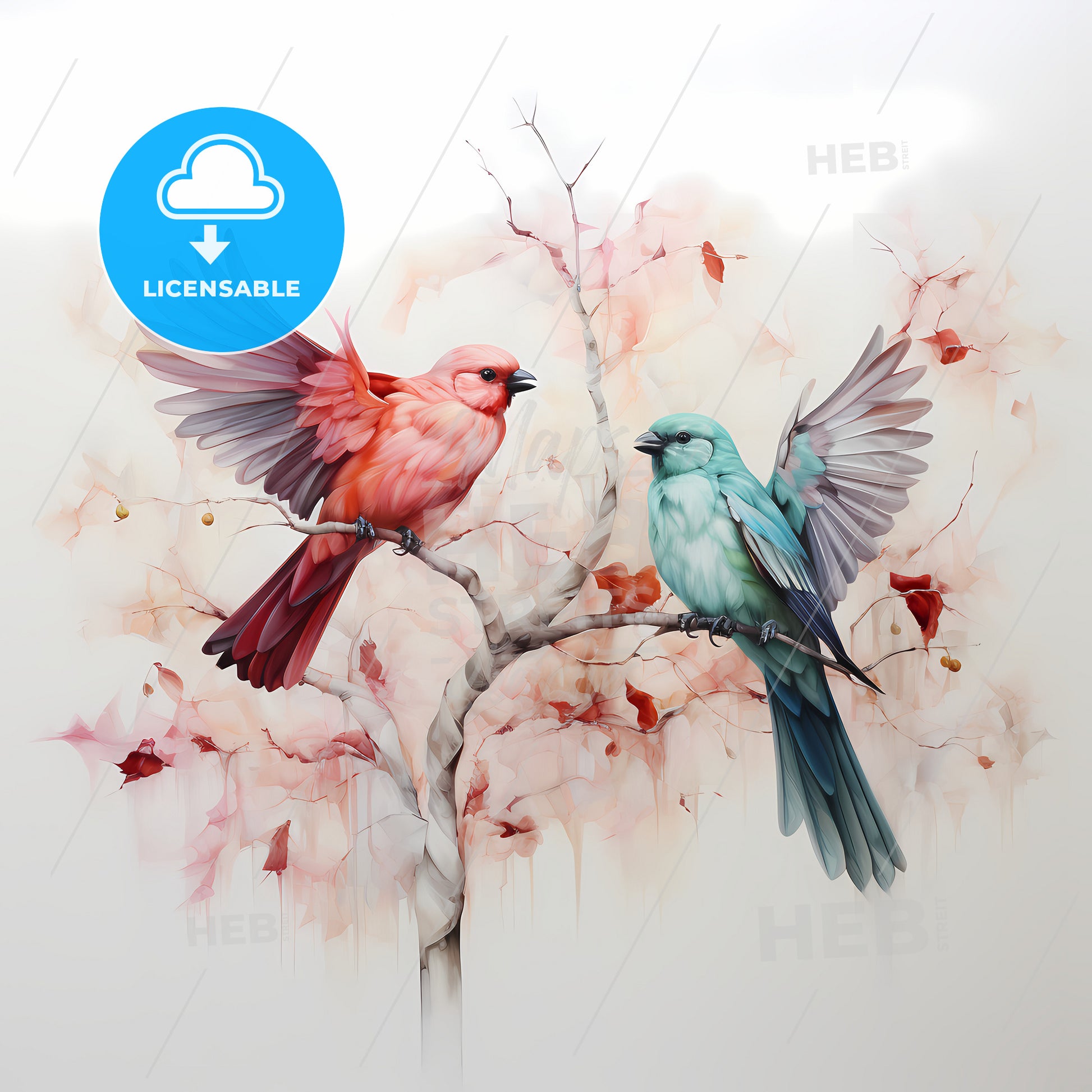 Three Birds Flying Different Postures Scattered, a couple of birds sitting on a tree branch.