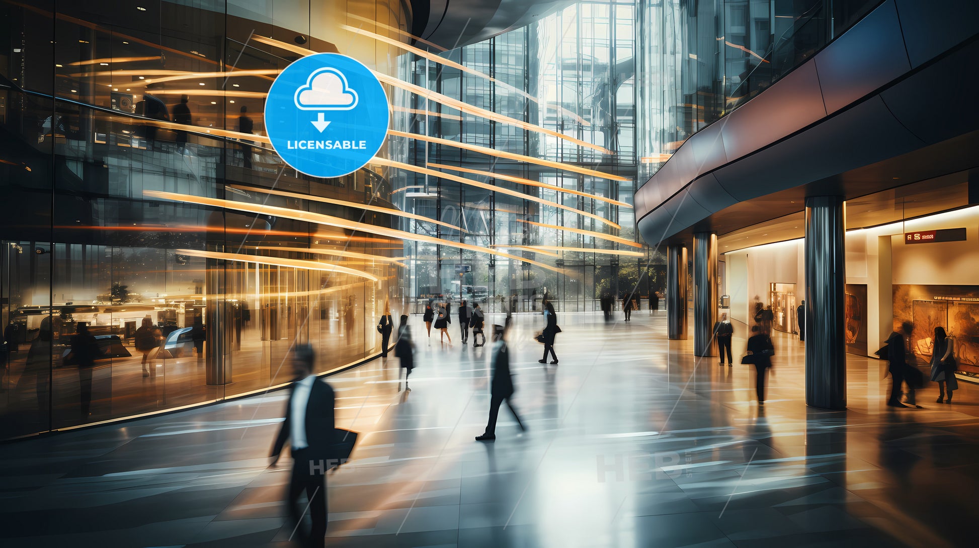 Top View Long Exposure Shot Of Modern Office, a group of people walking in a large room.