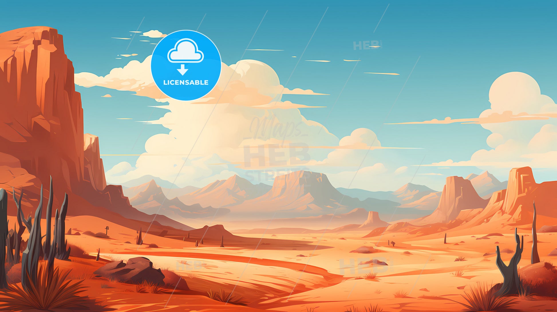2D Flat Vector Of Sahara Desert, a landscape of a desert with mountains and blue sky.