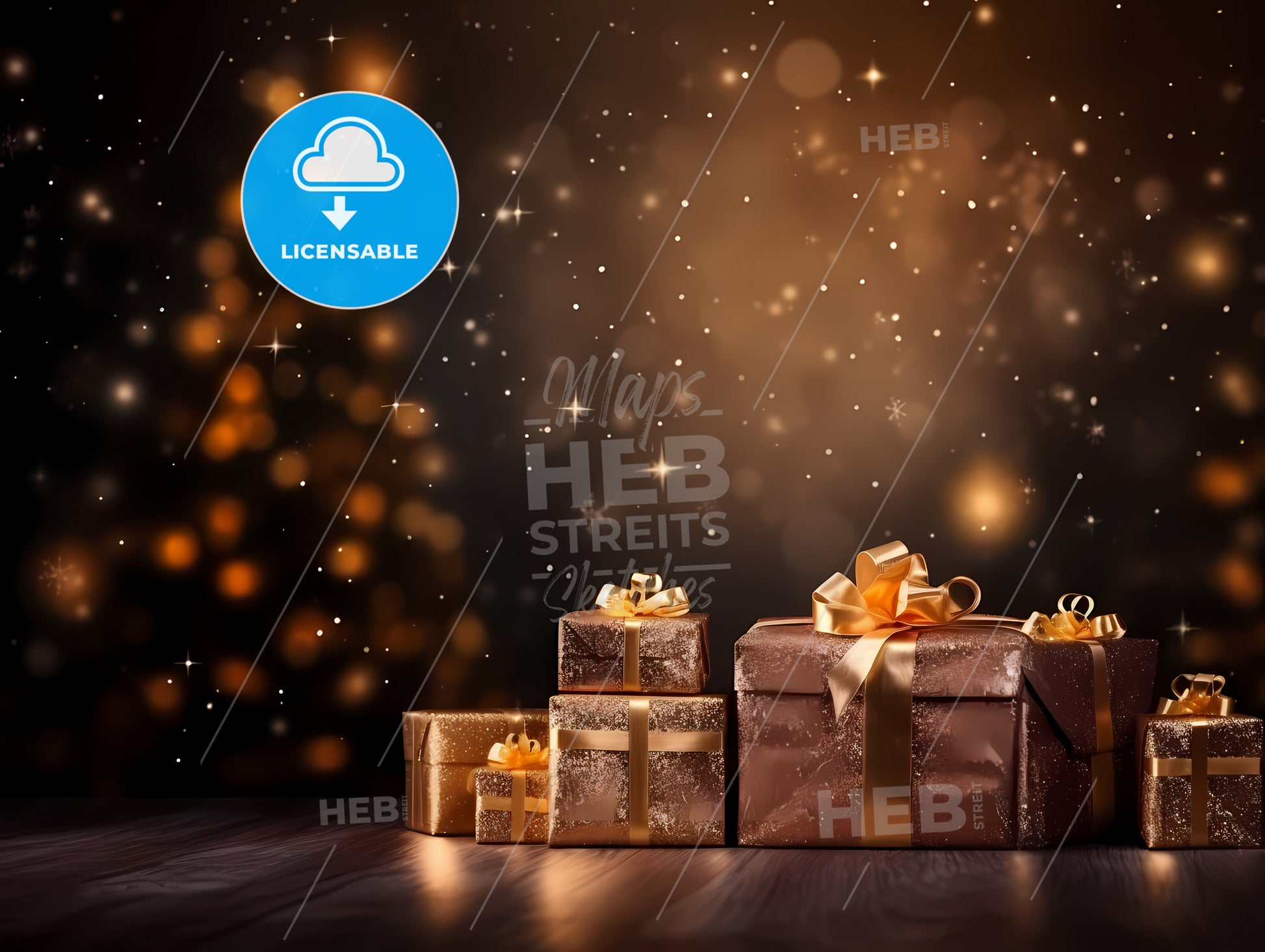 Composition Of Christmas Gift And Christmas Tree, a group of presents with gold ribbons.