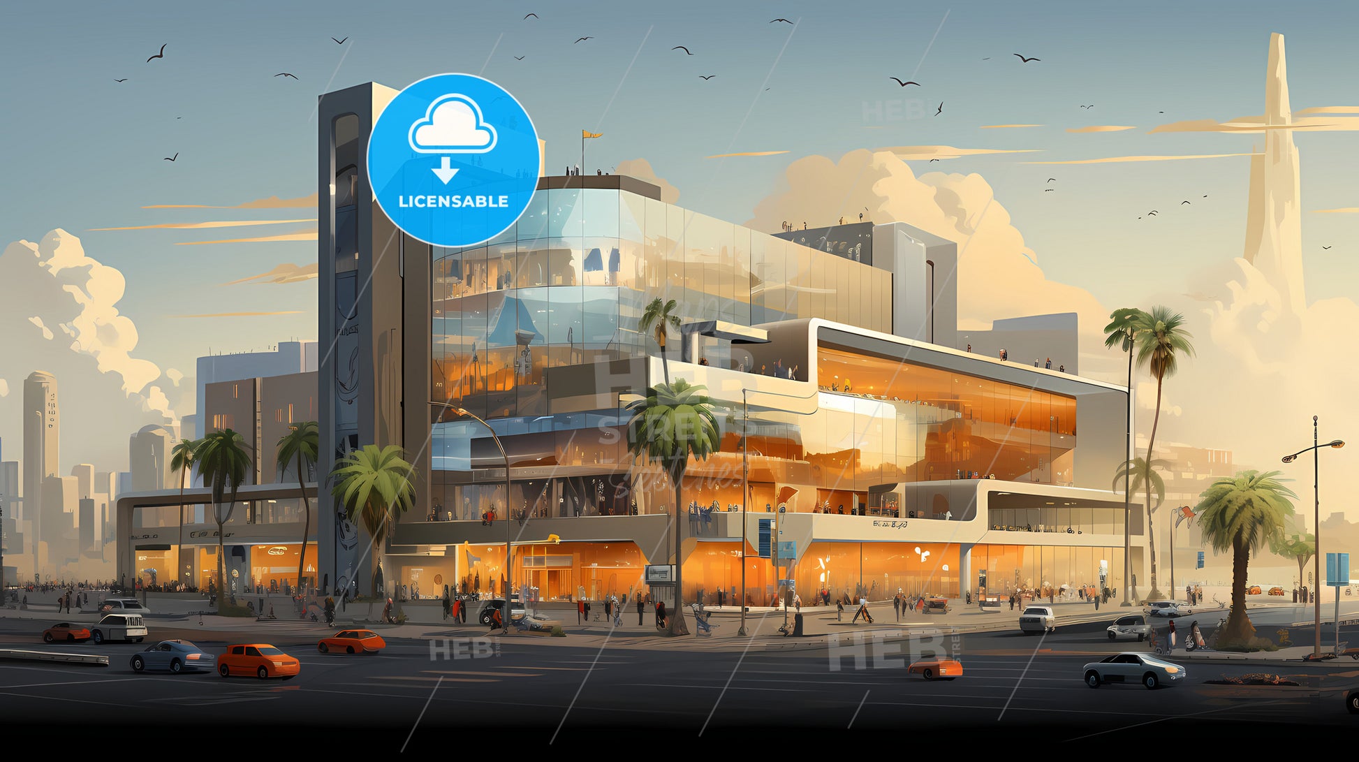 Saudi Mall Building On Grey Background, a large glass building with people walking on the street.