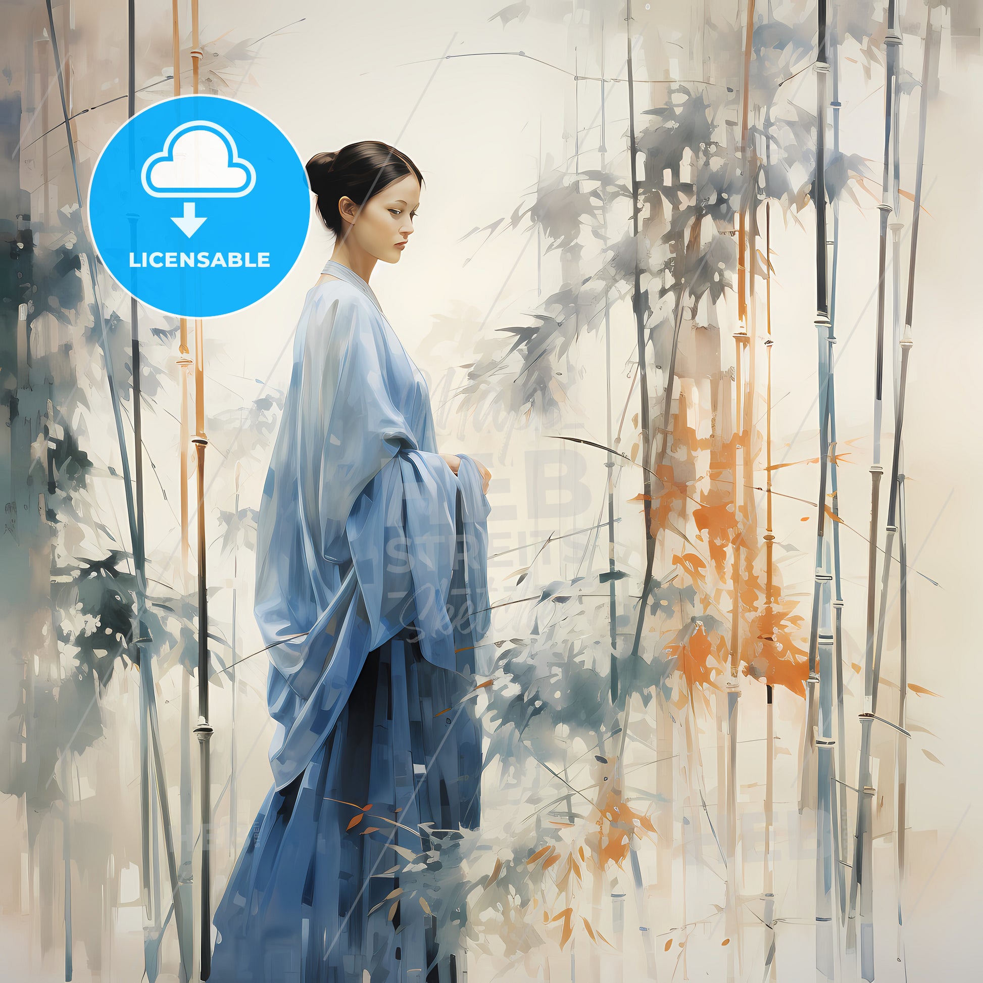 Chinese Painting Of Woman Beside Bamboo Trees, a woman in a blue dress.