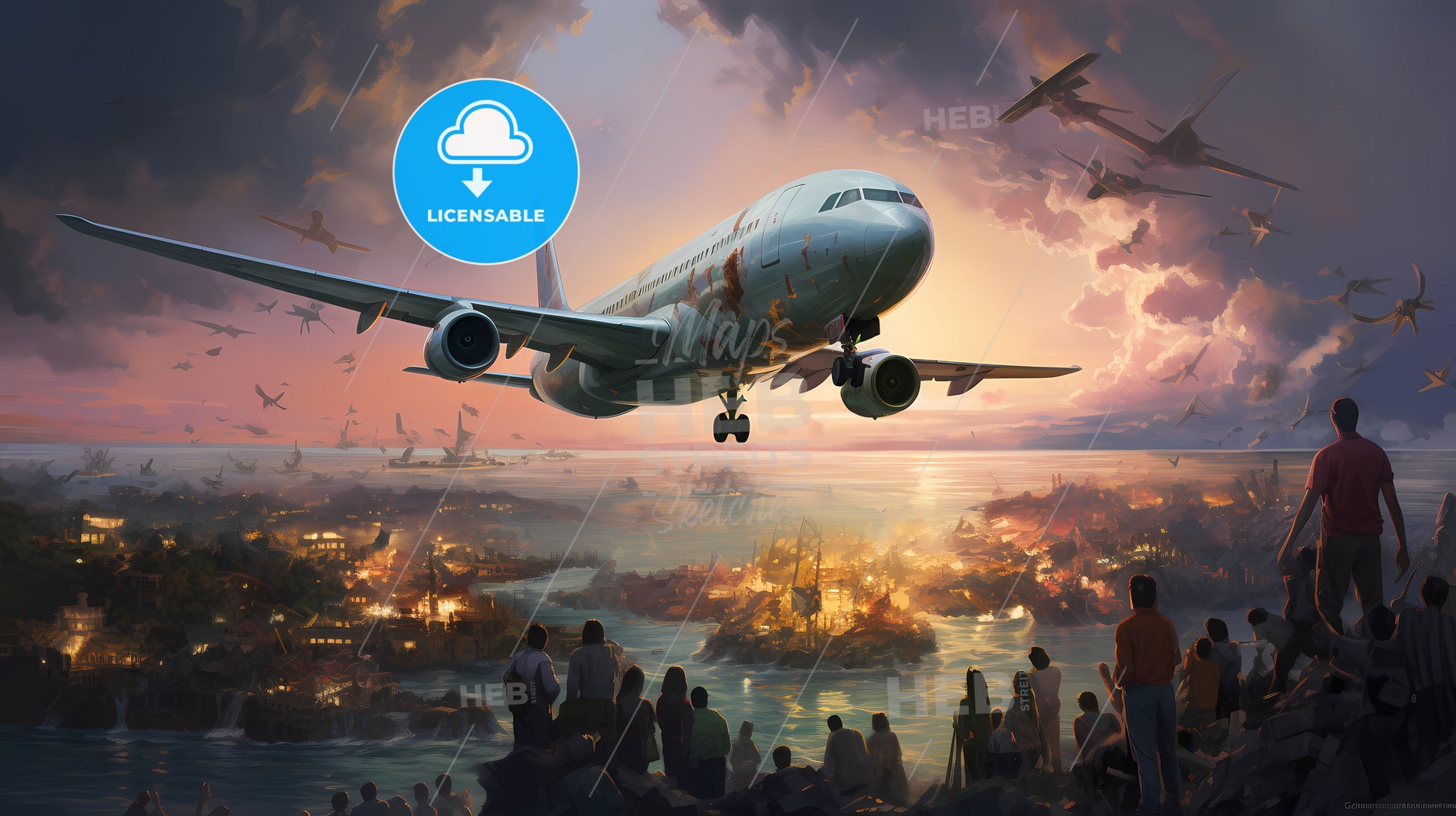 Someone Buying A Cheap Flight, a large airplane flying over a city.