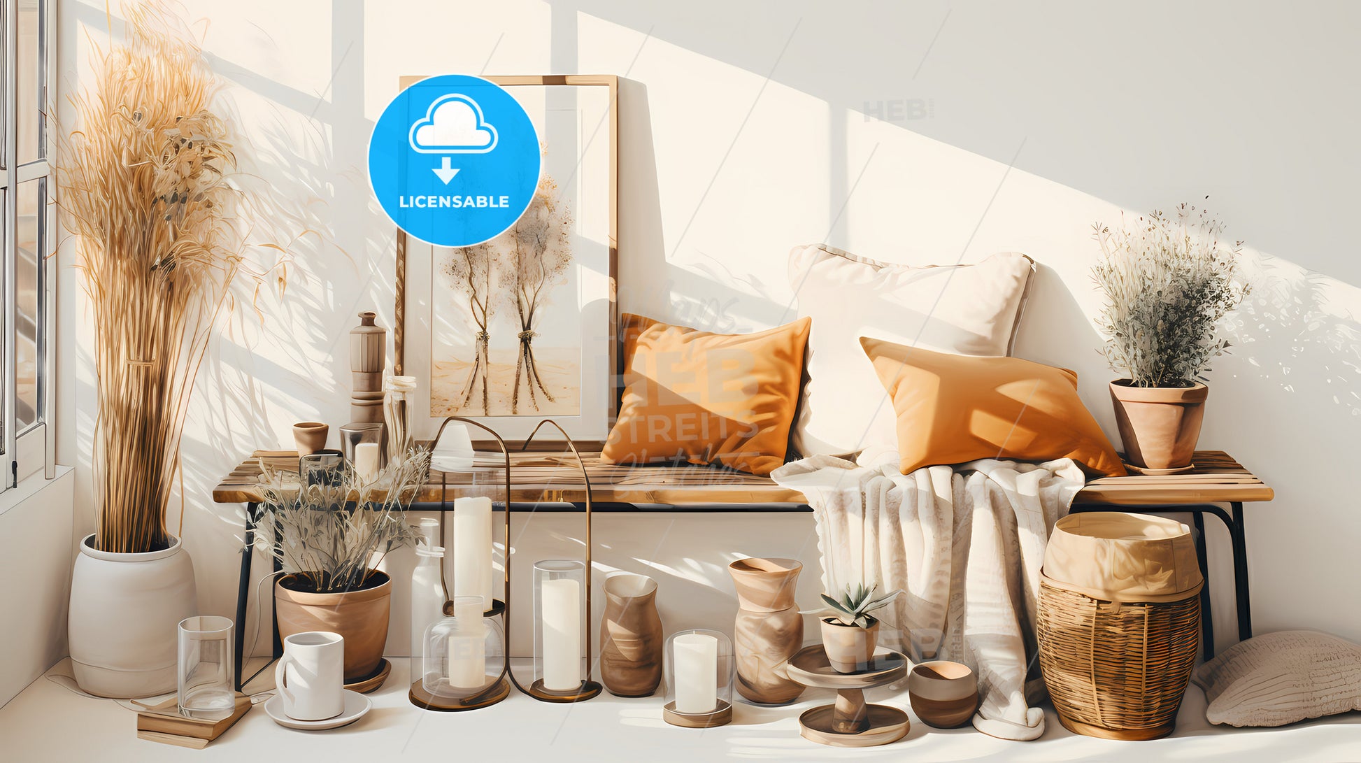 Modern Composition Of Home Decor, a room with a bench and a painting.