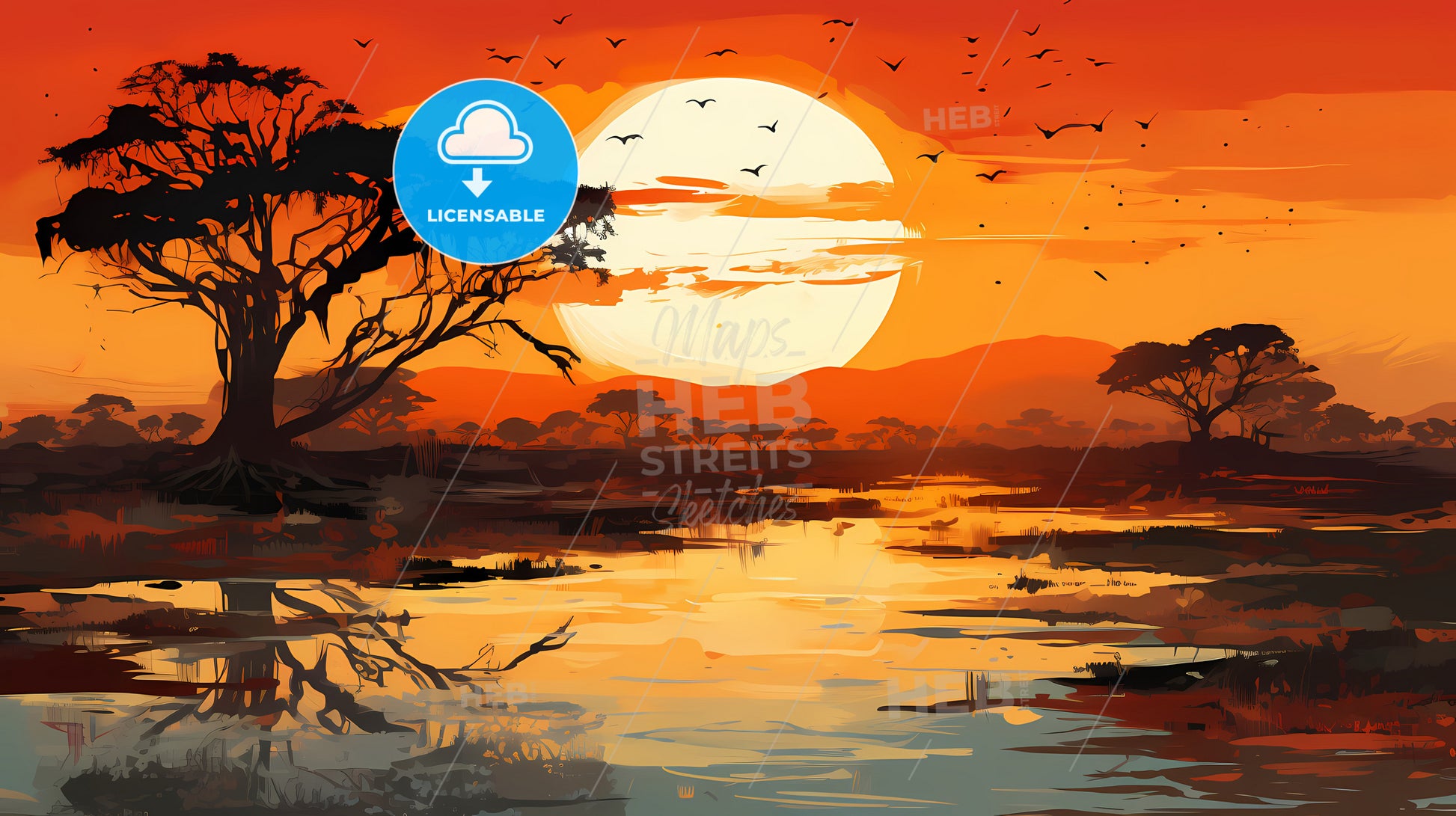 Animals In The Serengeti Acacia Trees, a sunset over a lake.