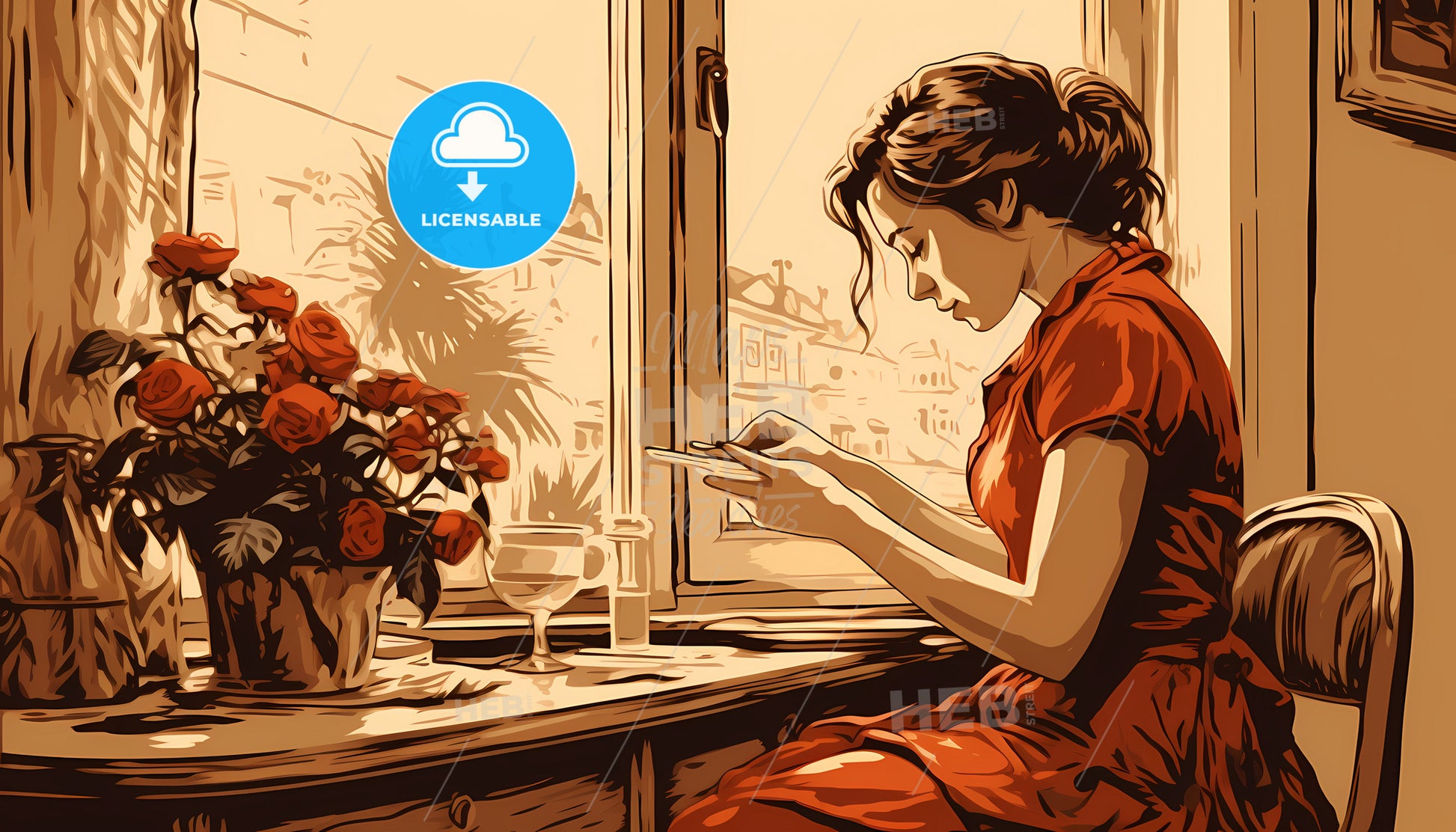 A Woman Is Using A Smartphone At Home, a woman sitting by a window.