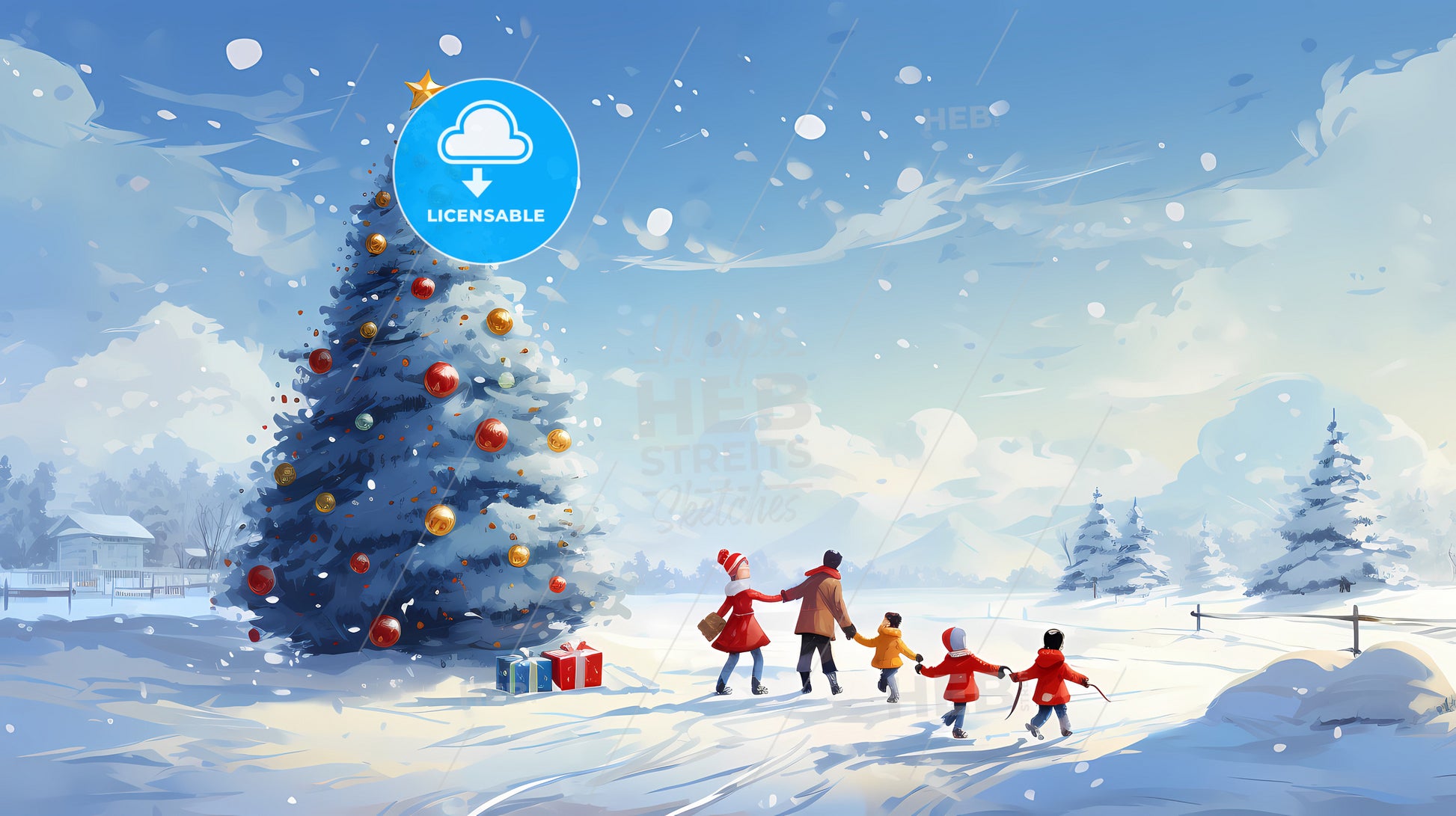White Snow Blue Sky Christmas Tree, a family walking in the snow with a christmas tree.