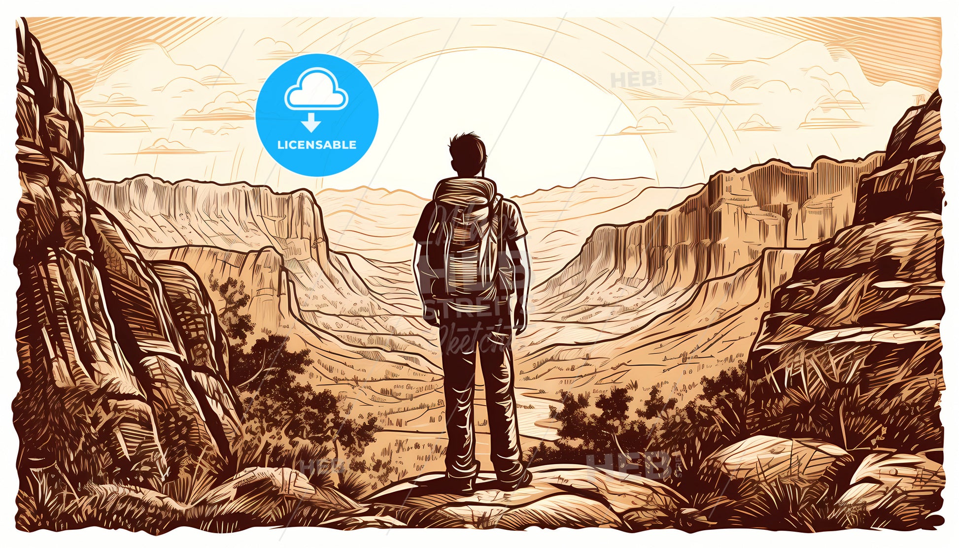 Male Backpacker Looking At Majestic Canyon View, a man standing on a rock looking at a valley.