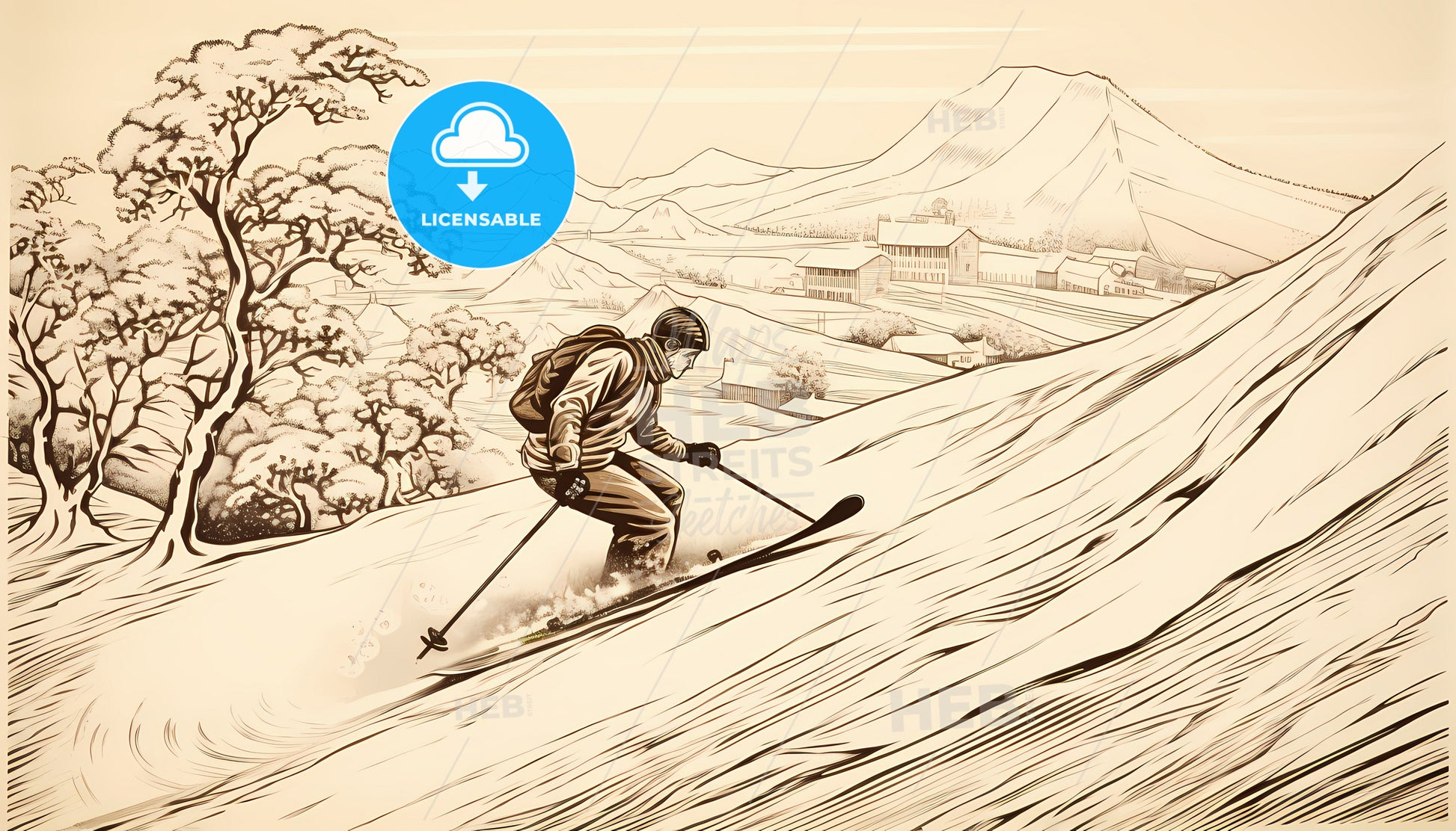 Downhill Skier Descending Snowy Mountain Slope, a man skiing down a mountain.