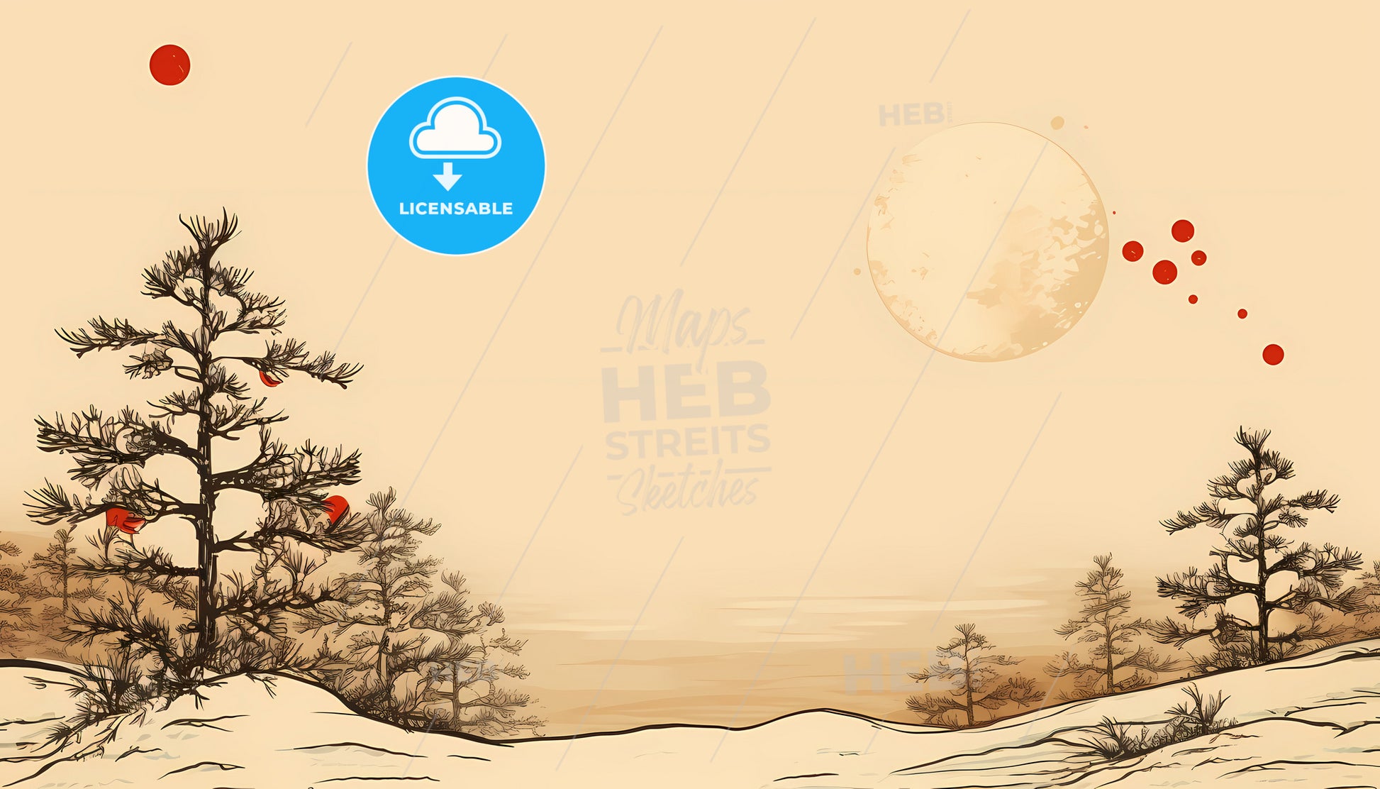 Minimalist Christmas Background, a snow covered landscape with trees and a full moon.