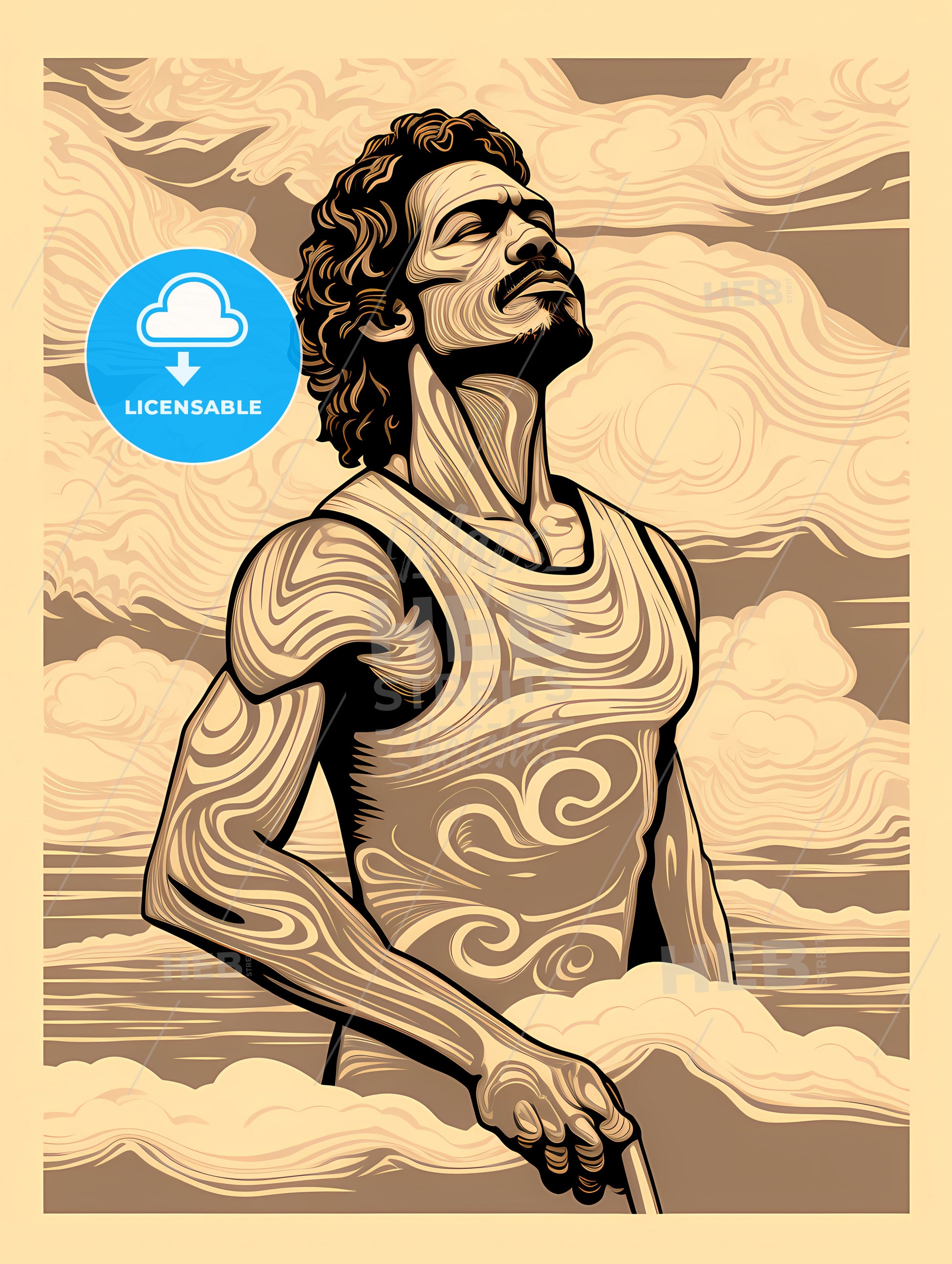 Dharawal Man Wearing White Body Paint, a man with curly hair and a tattoo on his shirt.
