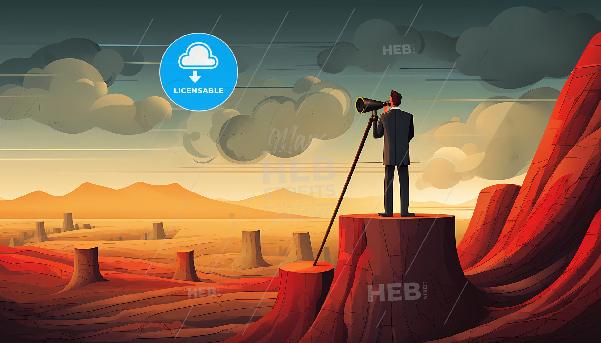 A Man Looking Through A Spyglass, A Man Looking Through A Telescope On A Stump. Stock Illustration generated with help of high resolution generative AI. License available for private and commercial use.