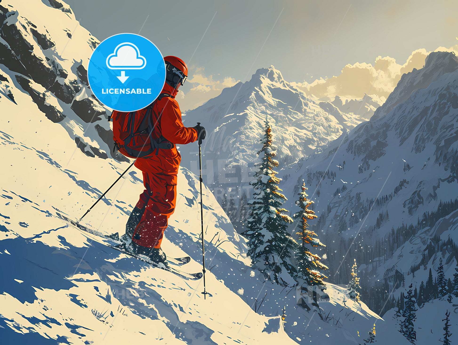 A Travel Poster With A Skier, A Person Skiing Down A Mountain. Stock Illustration generated with help of high resolution generative AI. License available for private and commercial use.