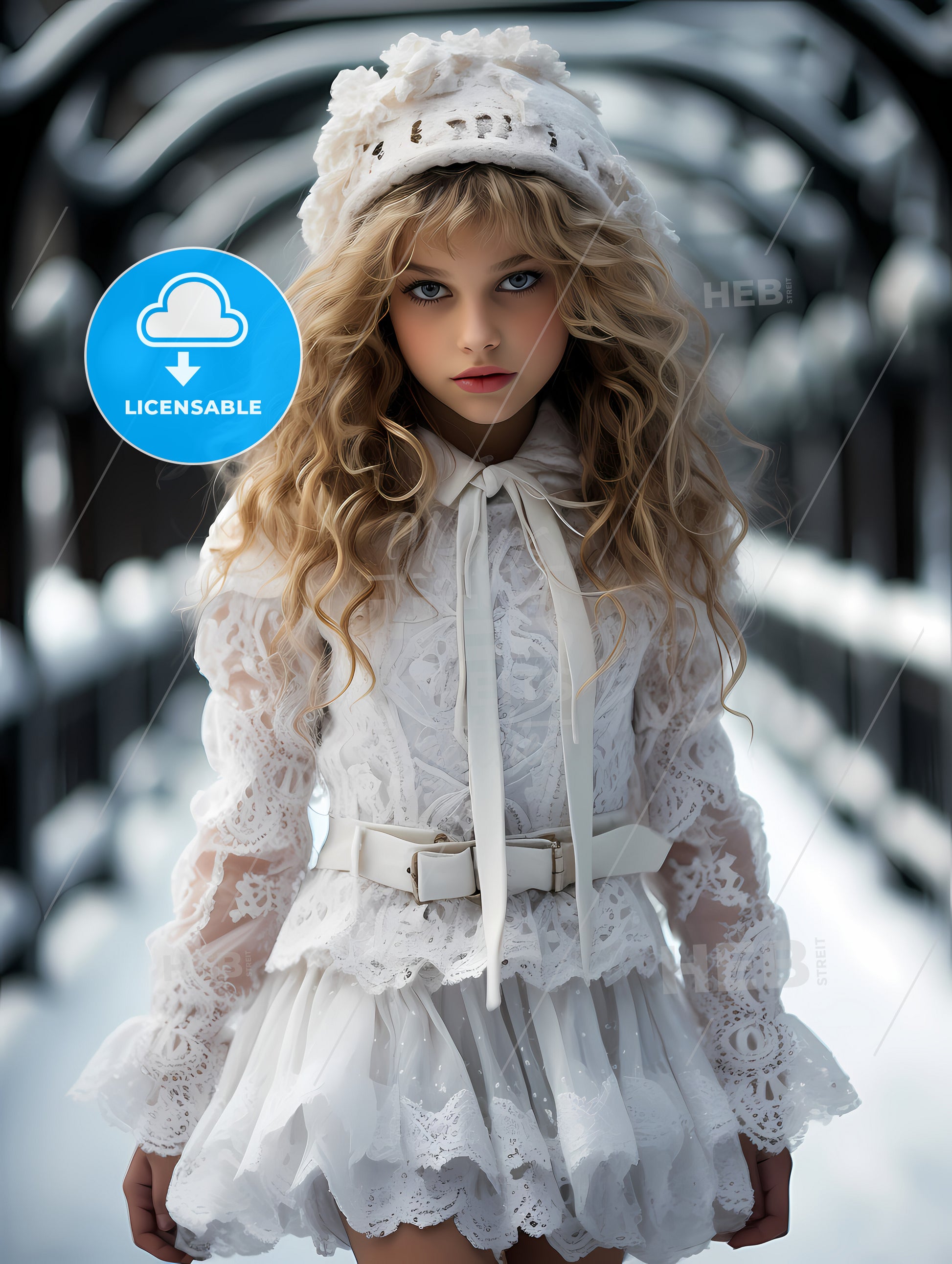 In The Cold Season Of Snowflakes, A Girl In A White Dress. Stock Illustration generated with help of high resolution generative AI. License available for private and commercial use.