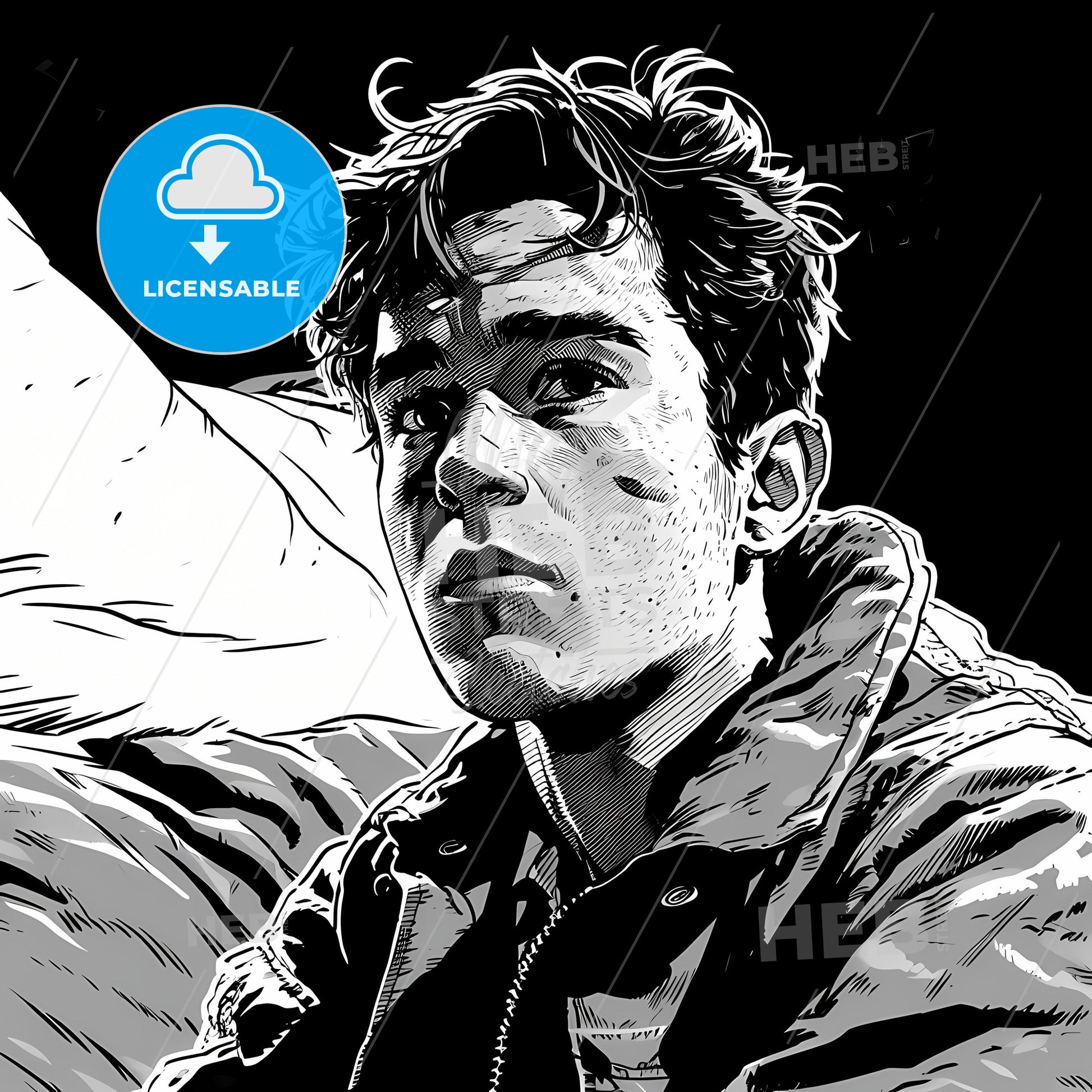 A Young Man Sitting Shocked In His Bed, A Man Looking At The Camera. Stock Illustration generated with help of high resolution generative AI. License available for private and commercial use.