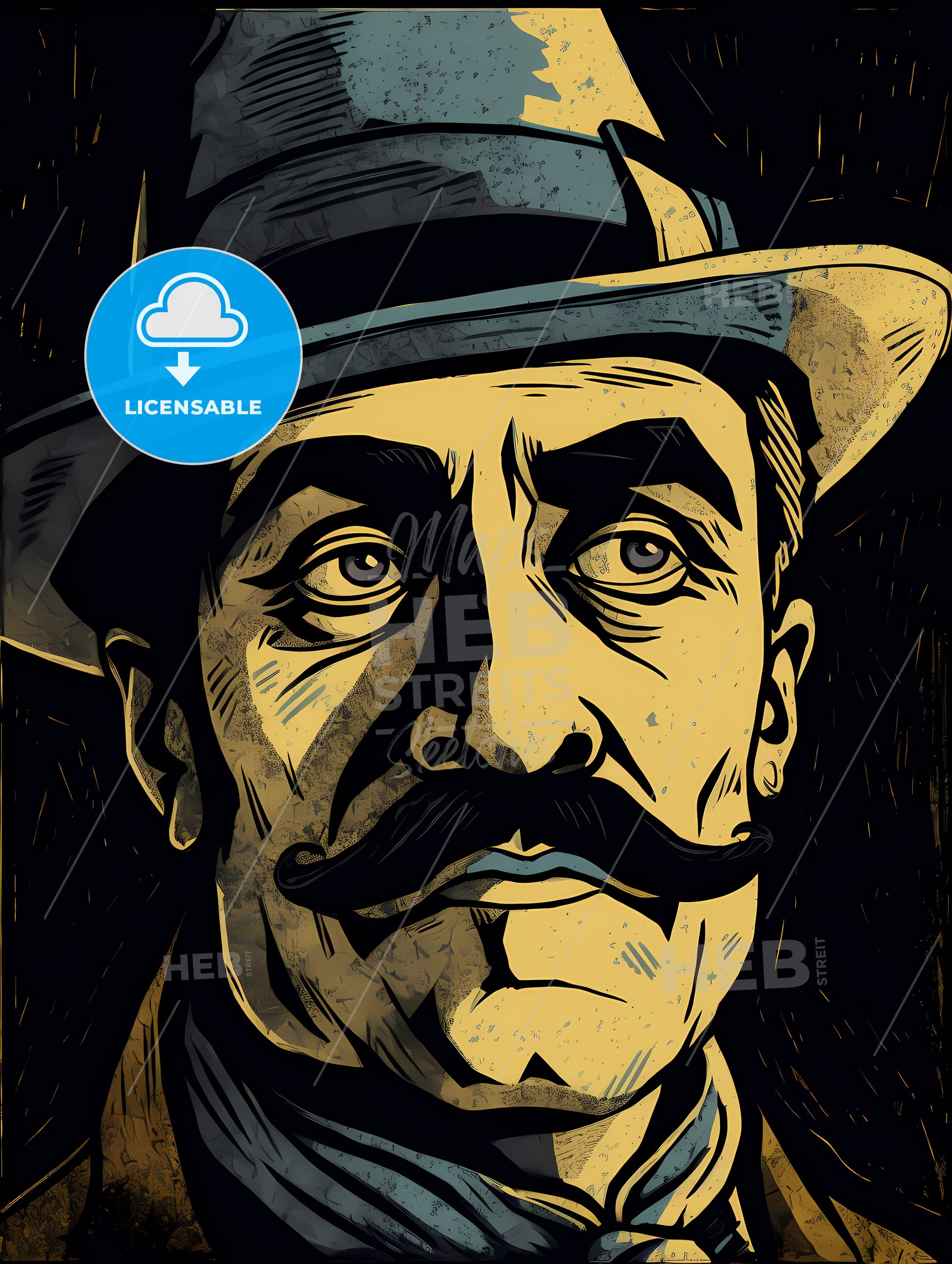 Early 20Th-Centry Poster-Style Linocut, A Man With A Mustache Wearing A Hat. Stock Illustration generated with help of high resolution generative AI. License available for private and commercial use.
