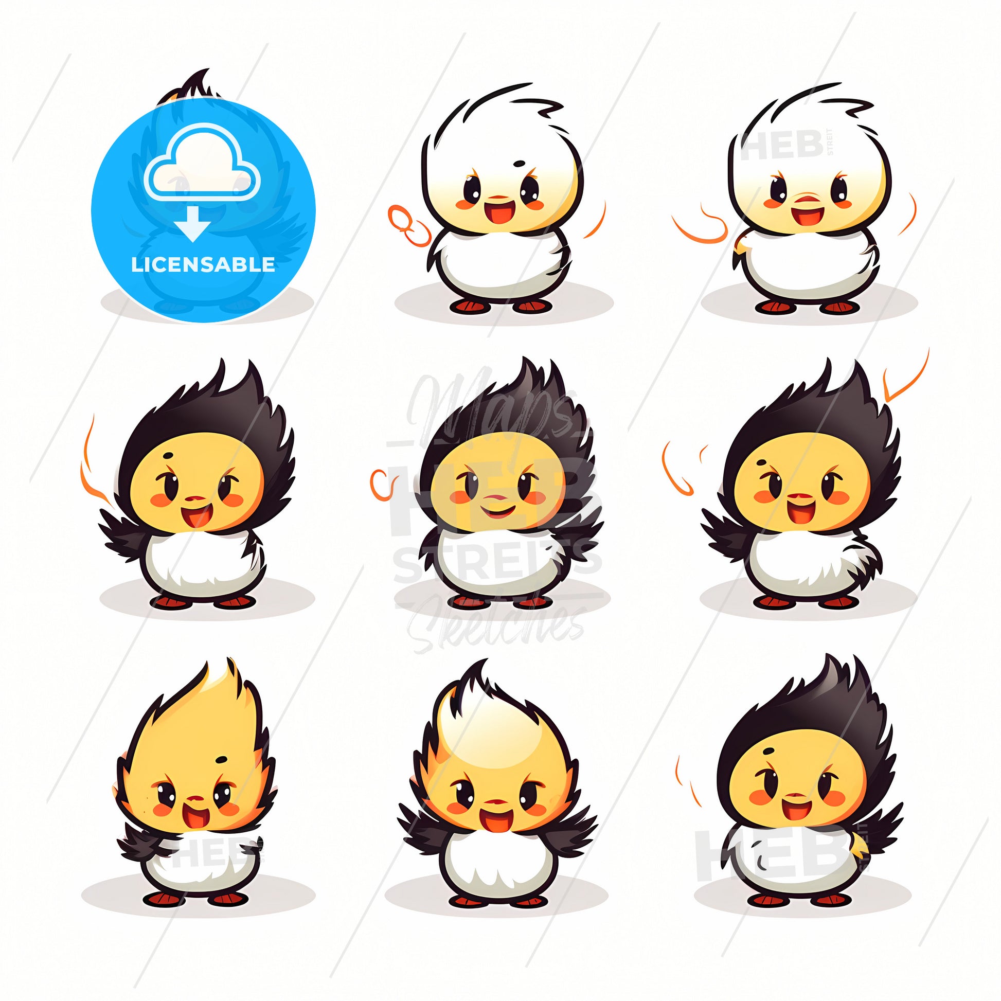Cute Chibi Chicken Character, A Group Of Cartoon Birds. Stock Illustration generated with help of high resolution generative AI. License available for private and commercial use.